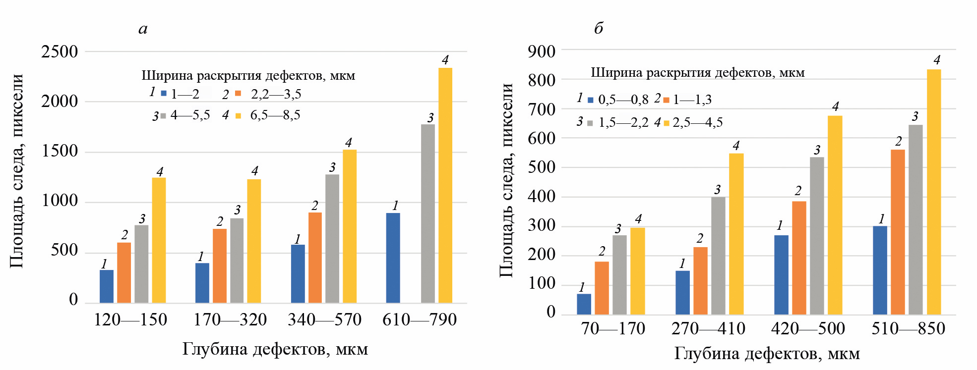 Рис. 4. Зависимости площадей следов дефектов от их ширин раскрытия в диапазоне 0,5—8,5 мкм: а — длина дефектов L = 17 мм; б — L = 15 мм. Пенетрант — Bycotest FP42