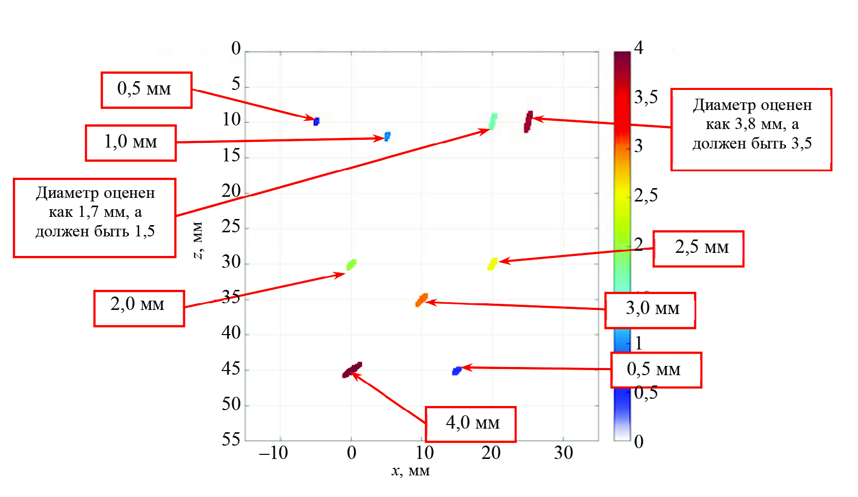 На рис. 1б показано АРД-изображение как диаметр эквивалентного ПДО d(xi, zi). Цветовая шкала справа от растрового изображения соответствует диаметру ПДО от 0 до 4 мм. Все диаметры эквивалентных ПДО совпали с заданными при расчете в CIVA диаметрами ПДО с точностью ±0,1 мм, за исключением ПДО диаметром 3,5 мм в точке (25, 10) мм — его эквивалентный диаметр получился равным 3,4 мм.