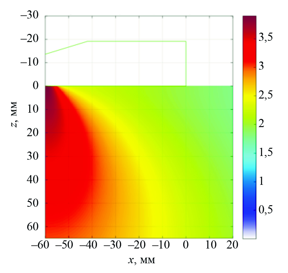 На рис. 5 показан вид функции D(xi, zi), рассчитанный по формуле (5), для коэффициентов затухания продольной волны в призме и материале, равных (0,2, 0,002) мм-1. Многоугольником зеленого цвета показан контур призмы.