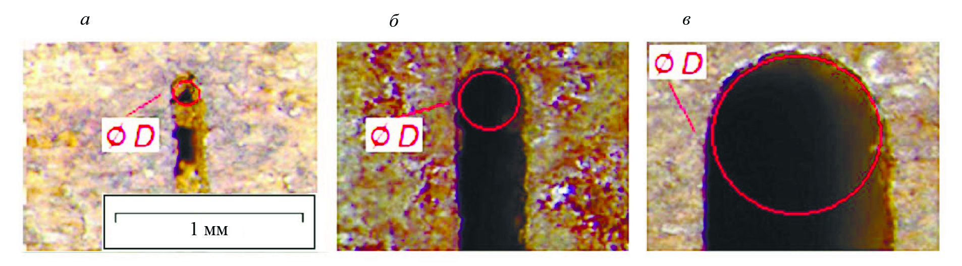 В TOFD главная анализируемая характеристика — не амплитуда сигналов, а время их приема. При раскрытии паза в доли миллиметра это время можно фиксировать в пределах ориентировочно 0,1 мкс, что достаточно для измерения координат острия в стали или алюминии с точностью в пределах 0,6 мм для продольной волны или 0,3 мм для поперечной. Иная ситуация имеет место при анализе амплитуд сигналов от пазов. На частоте 5—10 МГц диаметр закругления электроэрозионного паза близок к 0,4 длины волны. Экспериментальные результаты свидетельствуют о том, что угловые зависимости амплитуд сигналов, рассеянных на таких закруглениях, аналогичны рассеянию на БЦО, а не на острие полуплоскости, имитирующем трещину [48]. Поэтому амплитуду сигнала, рассеянного торцом паза, даже при минимально достижимом его раскрытии нельзя использовать для оценки наличия или отсутствие острия у реального дефекта. Причина становится очевидной, если сравнить рис. 13 с рис. 14, на котором в аналогичном масштабе показаны микрошлифы стальных образцов с трещинами: раскрытие трещин существенно меньше даже при самом малом раскрытии пазов.