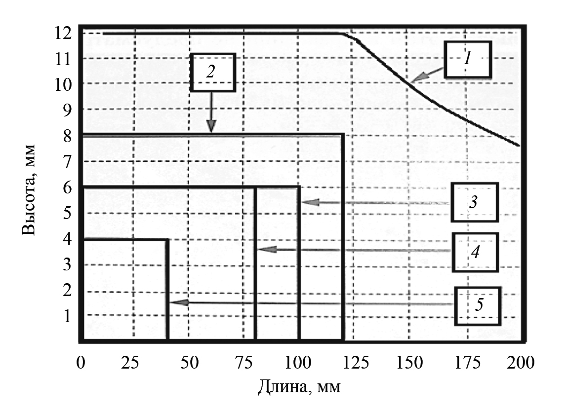 Далее рассмотрим перспективы использования различных искусственных отражателей для настройки параметров УЗ контроля с учетом автоматизации сканирования, цифровой обработки сигналов и представления информации о дефектах в сечениях изделий. Один пример был приведен при иллюстрации возможности измерения толщины изделия по В-скану. На рис. 15 приведен другой пример изображения сечения металла: S-скан стыкового сварного шва толщиной 9 мм, полученный фазированной антенной решеткой (ФАР) с углами ввода в диапазоне 45—70о. При наложении этого изображения на разделку кромок видно, что сигналы 1-1 и 1-2 на прямом и отраженном лучах получены от несплавления 1, а сигнал 2 — на прямом луче от шлакового включения 2.