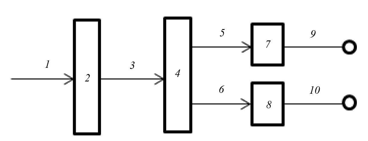 Рис. 1. Схема формирования цифровых сигналов для отдельного детектора из линейки, сопряженного с двухканальным аналоговым амплитудным анализатором: 1 ― поток квантов рентгеновского излучения, падающих на детектор; 2 ― детектор излучения; 3 ― поток электрических импульсов на выходе детектора; 4 ― аналоговый амплитудный анализатор; 5 ― поток низкоэнергетических электрических импульсов; 6 ― поток высокоэнергетических электрических импульсов; 7, 8 ― устройство регистрации (счетчик импульсов); 9 ― низкоэнергетический цифровой сигнал; 10 ― высокоэнергетический цифровой сигнал.