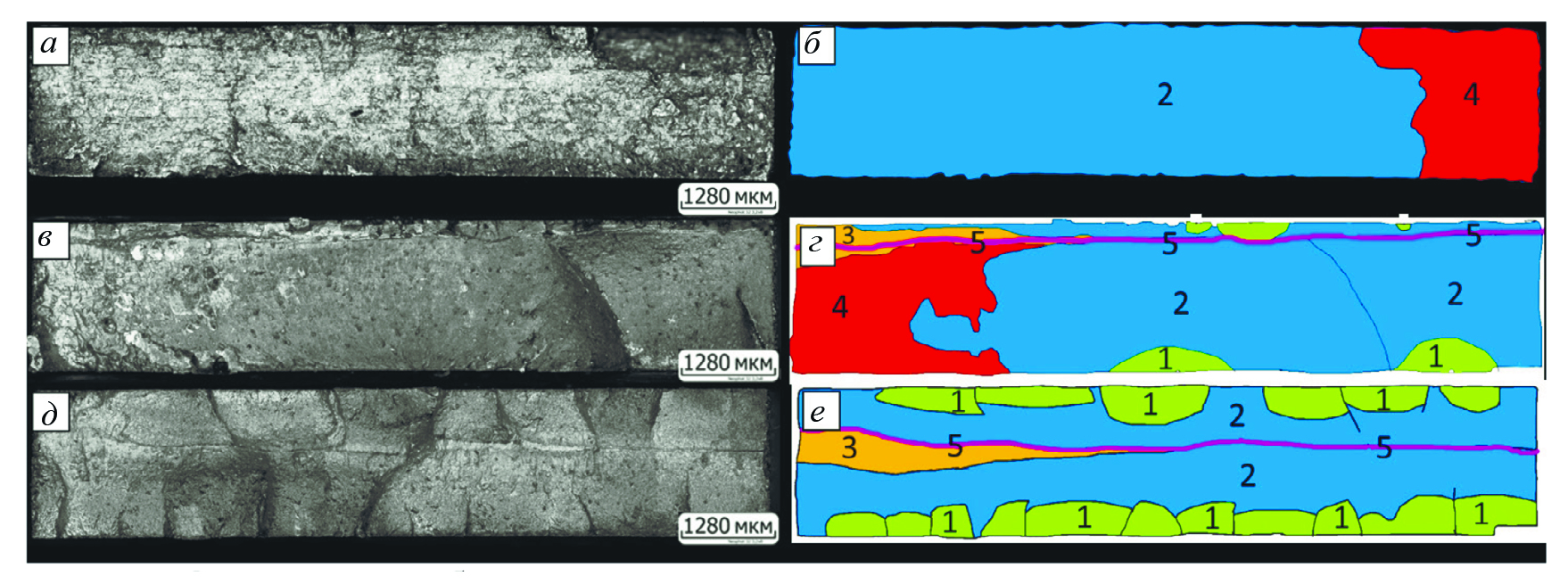 Образец № 1 из литой стали 09Г2С характеризуется прямым и однородным усталостным изломом без обнаруженных очагов зарождения трещин (рис. 2а), имеется зона доло- ма 4 (рис. 2б). Образец № 2 из 3D-стали после отжига и нормализации также имеет прямой излом (рис. 2в), но он неоднороден по длине. Имеются несколько точечных очагов разрушения 1 с поверхности на противоположных сторонах образца, на одном из торцов имеется зона долома 4, гребень отрыва 5 сильно смещен к верхнему краю (рис. 2г). Образец № 3 из 3D-стали демонстрирует косой (рис. 2д) и неоднородный излом, с несколькими очагами разрушения 1, сливающимися в сеть ступенек и рубцов, при этом гребень отрыва 5 расположен ближе к центральной линии (рис. 2е).