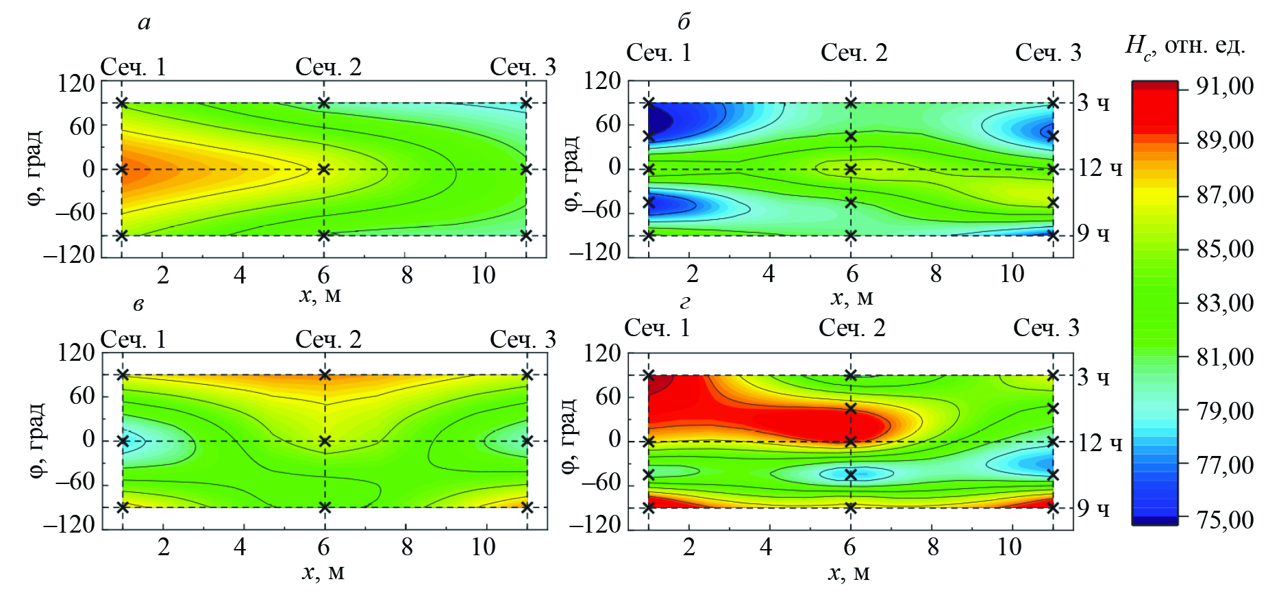 Рис. 1. Распределение коэрцитивной силы по трубе до гидроиспытания (а, в) и во время гидроиспытания (б, г), измеренной по оси (а, б) и по кольцу (в, г); × — точки, в которых проводились измерения.