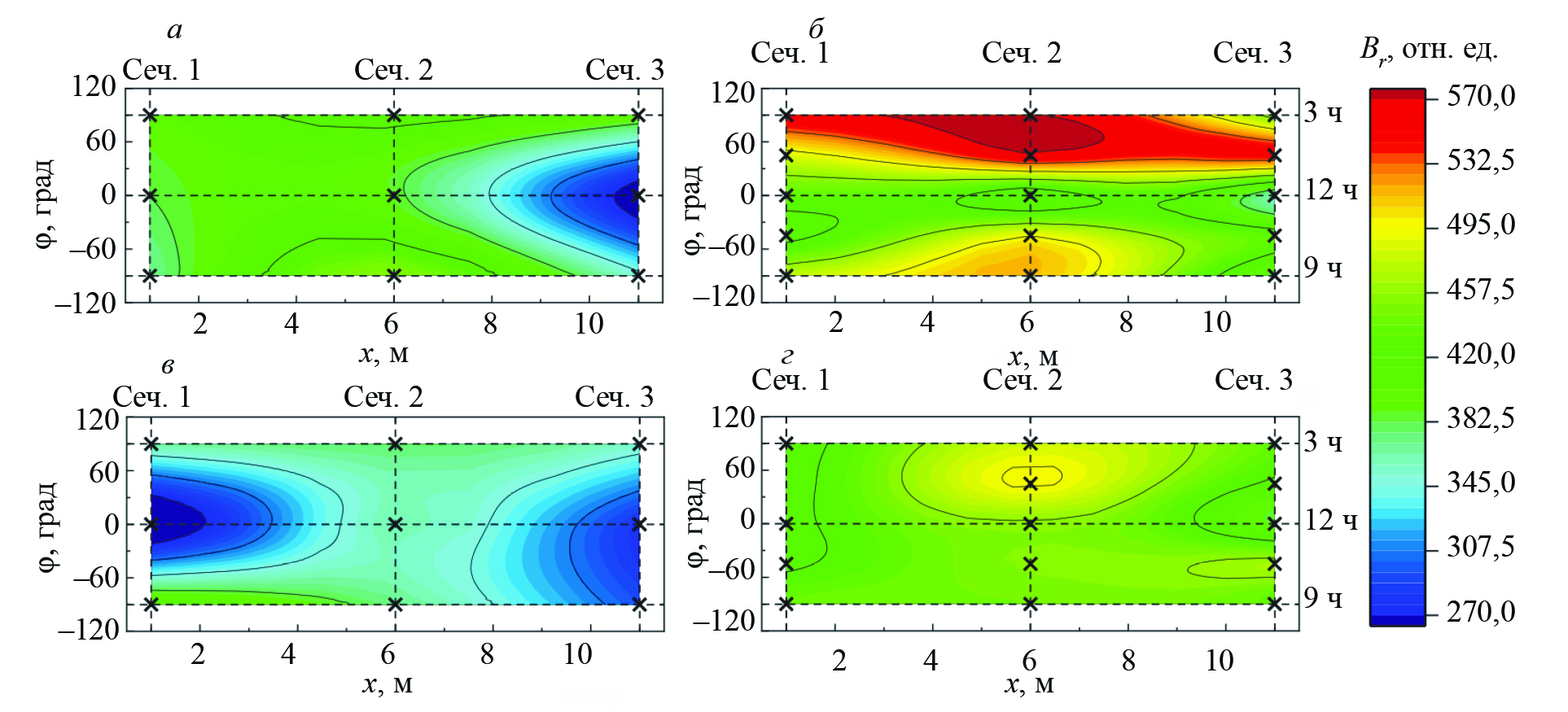 Рис. 2. Распределение остаточной магнитной индукции по трубе до гидроиспытания (а, в) и во время гидроиспытания (б, г), измеренной по оси (а, б) и по кольцу (в, г); × — точки, в которых проводились измерения.