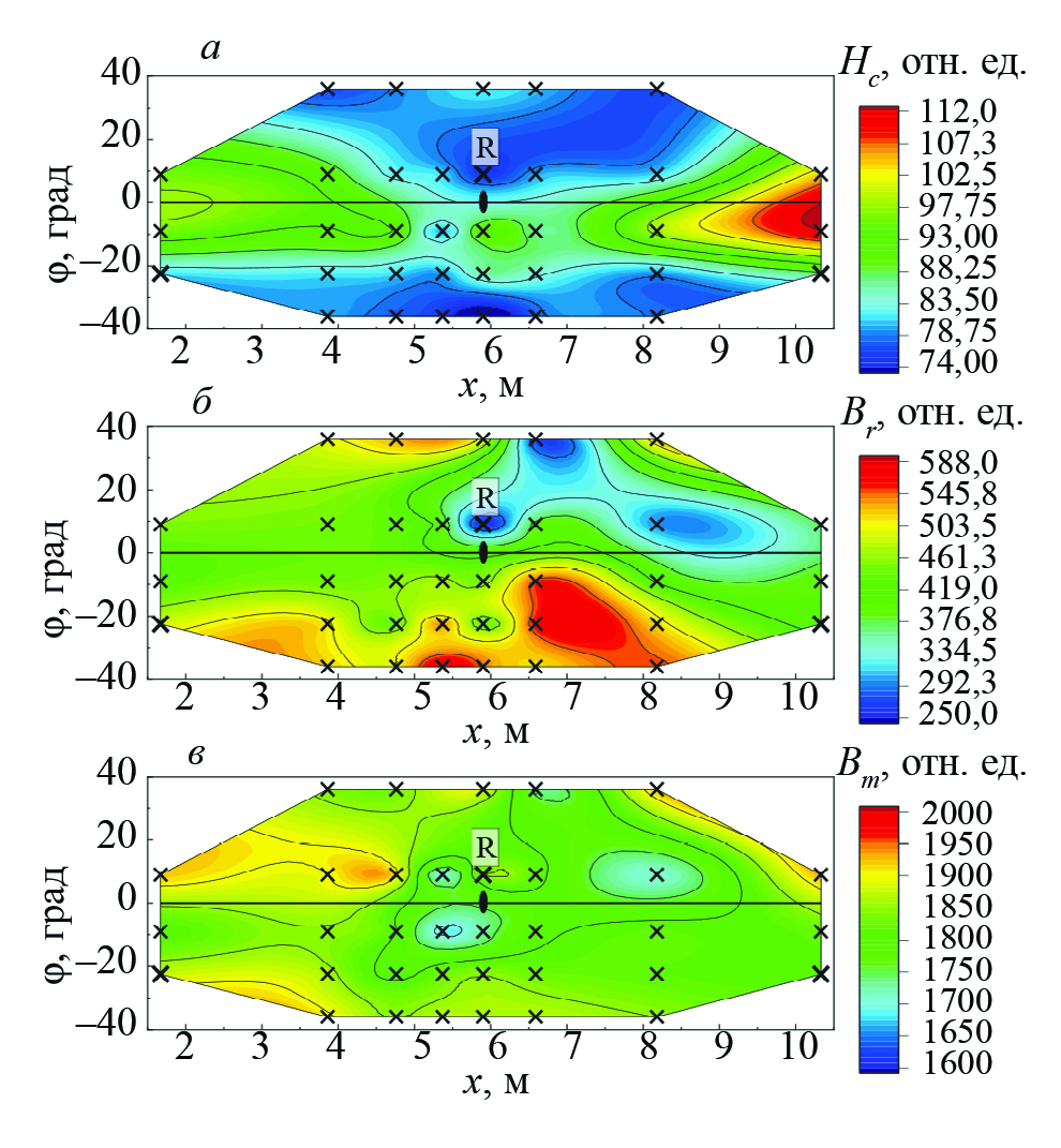 На рис. 3 показано распределение магнитных характеристик, измеренных на второй трубе из стали К80 возле места разрушения. Координата φ = 0 соответствует продольному шву, по которому и произошло разрушение трубы.