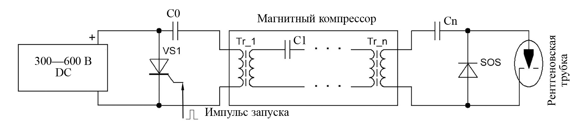 Структурная схема генератора для получения высоковольтных импульсов напряжения с использованием индуктивного накопителя энергии с полупроводниковым прерывателем тока SOS-диода представлена на рис. 1. Конденсатор C0 в первом контуре генератора заряжается до 600 В. После подачи импульса запуска на тиристор энергия из конденсатора C0 передается в магнитный компрессор. Магнитный компрессор представляет собой последовательность контуров с трансформаторами (в некоторых случаях с дросселями) и конденсаторами, на выходе из которого происходит существенное увеличении амплитуды импульса напряжения при уменьшении его длительности. Если амплитуда импульса после прохождения первого трансформатора составляет около 15 кВ, а длительность порядка нескольких мкс, то на выходе максимальное напряжение достигает значения 70 кВ при длительности импульса около 100 нс. Полупроводниковый прерыватель тока обеспечивает резкий обрыв тока, что создает бросок напряжения на нагрузке. Таким образом, напряжение на нагрузке достигает значения выше 140 кВ при длительности 30 нс. В зависимости от энергии, запасаемой в конденсаторе C0, настройки контуров магнитного компрессора и применения достаточного количества полупроводниковых прерывателей тока значение напряжения может достигать 1 МВ. Отсутствие разрядников обострителей, применяемых в большинстве промышленных импульсных рентгеновских источников, дает возможность генерировать импульсы с частой десятки кГц [28].