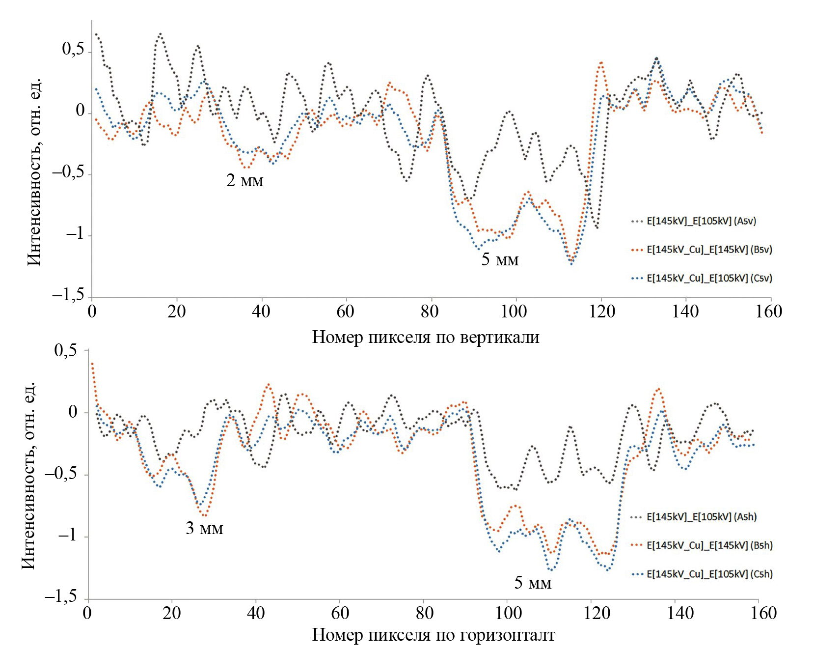 На рис. 8 представлены профили распределения интенсивности пикселей для обработанных при разных спектрах излучения изображений толщиной 5 мм.