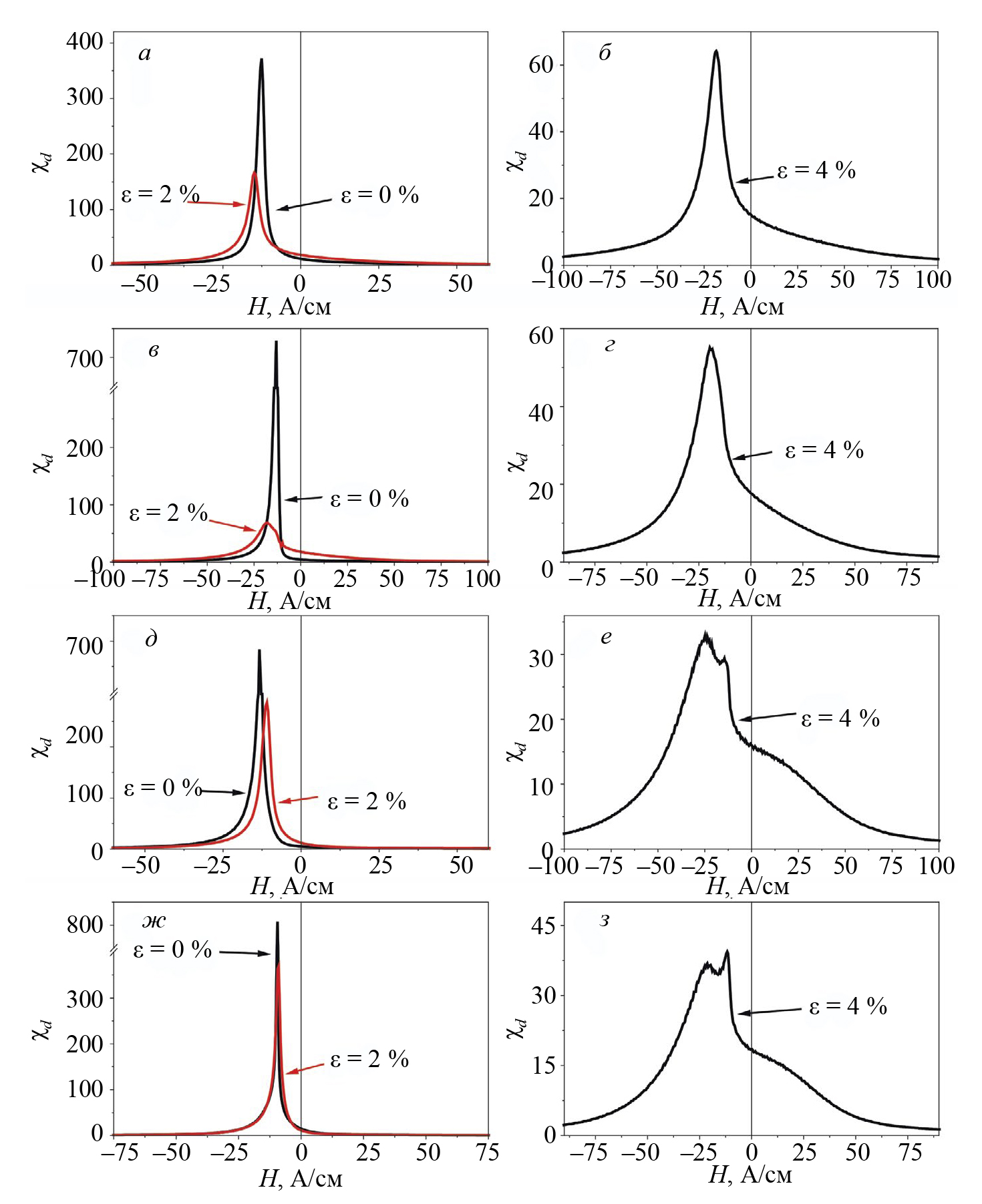Рис. 2. Полевые зависимости дифференциальной магнитной восприимчивости, пластически деформированных образцов из стали 38ХС, предварительно закаленных и отпущенных при 500 °С (а, б), 600 °С (в, г), 650 °С (д, е) и 700 °С (ж, з).