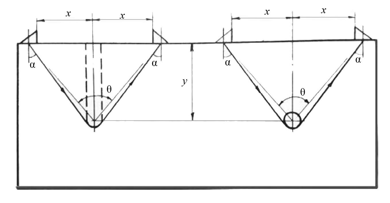 Выше рассматривались только совмещенные схемы выявления сферических и цилиндрических полостей. Не меньший интерес представляют и дифракционные эффекты, возникающие при раздельном излучении—приеме ультразвуковых волн. Рассмотрим, согласно [18], пример эксперимента, в котором также демонстрируется различие в рассеянии на цилиндрических и сферических полостях. Пусть излучение и прием поперечных волн выполняется обычными наклонными ПЭП по схеме, показанной на рис. 10. В образце из алюминиевого сплава использовались: БЦО в качестве модели цилиндрической полости, сверление со сферическим дном в качестве модели сферы. Диаметры сверлений — 6 мм. Скорость поперечных волн 3,1×103 м/с. Результаты измерений приведены в табл. 3.