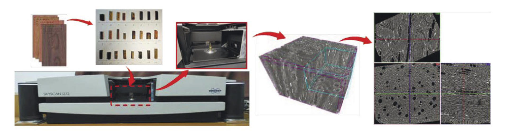 Как показано на рис. 1, были получены микроскопические изображения (поперечные, радиальные и тангенциальные срезы) 24 ценных пород деревьев с помощью трехмерной рентгеновской микротомографии высокого разрешения. Процедура эксперимента включала несколько этапов.
