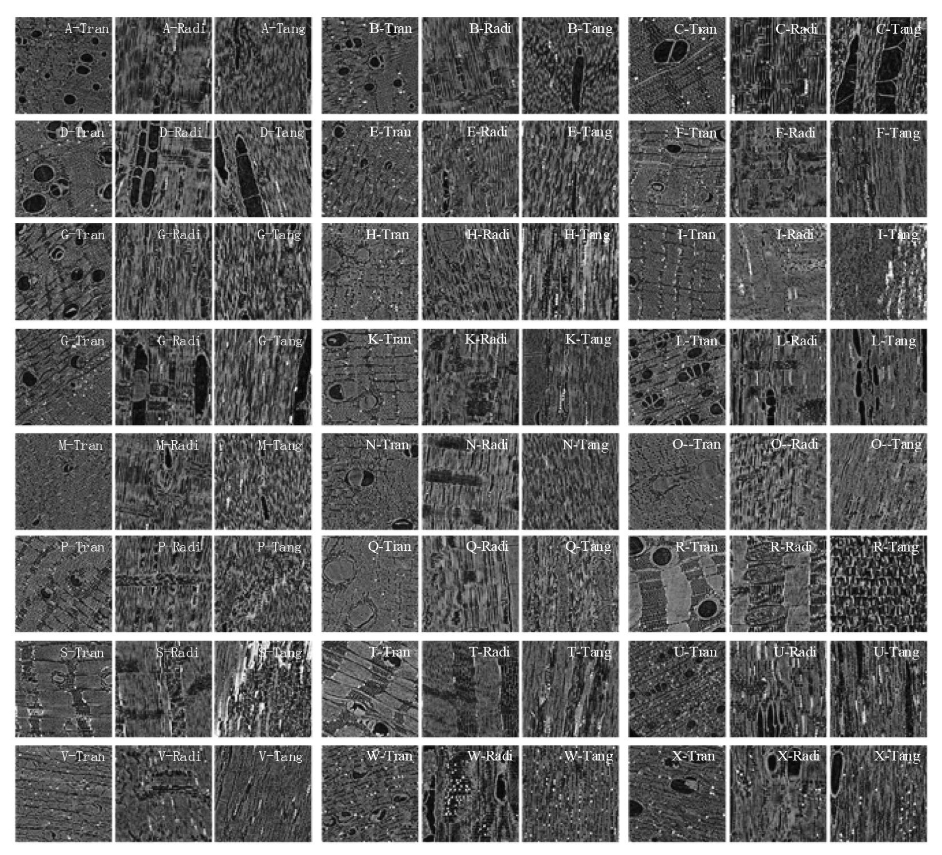 После восстановления отсканированных изображений было получено 3000 изображений для каждого образца. Из них 1000 изображений — для поперечных срезов, 1000 — для радиальных и 1000 — для тангенциальных срезов. Размер изображений составлял 2042 × 1640 пикселей, разрешение — 2 мкм. На рис. 2 представлены изображения поперечных, радиальных и тангенциальных срезов 24 видов ценных пород древесины.