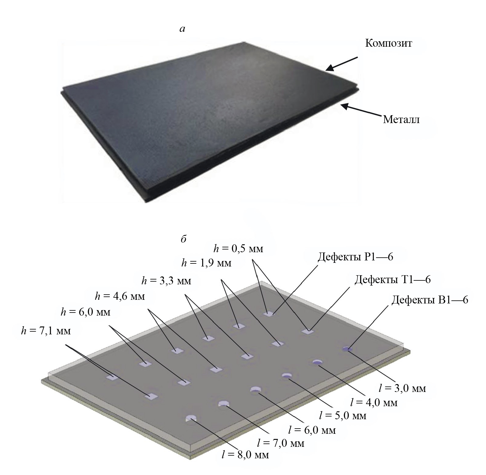 Рис. 1. Тестовый образец: фотография образца (а); схема дефектов (б).