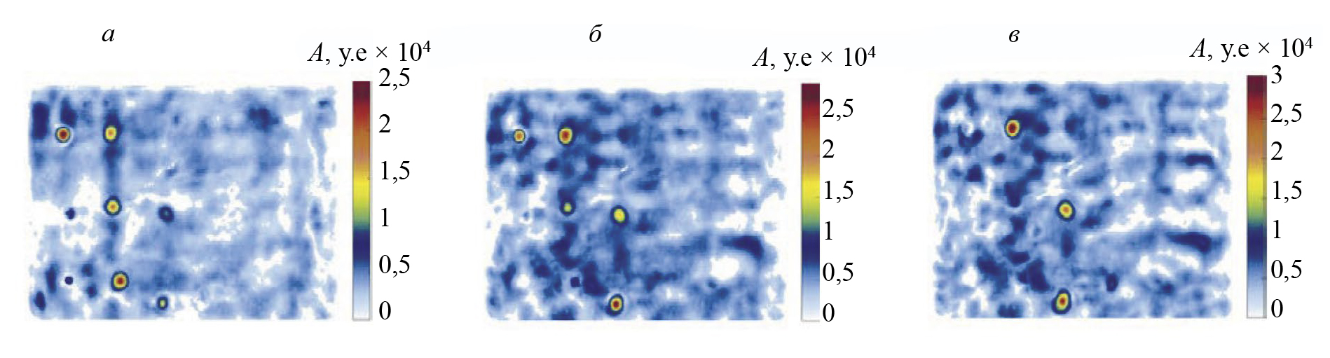 Рис. 5. Результаты акустического контроля тестового образца: карта дефектов, глубины 2-3 мм (а); карта дефектов, глубины 3-4 мм (б); карта дефектов, глубины 4-5 мм (в).