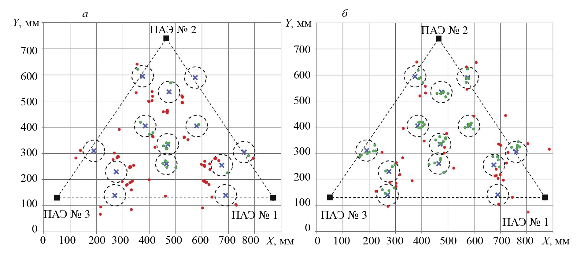 Рис. 6. Результаты построения планарной локации источников АЭ с помощью стандартного (а) и разработанного (б) алгоритмов: ■ — положение ПАЭ; X — положение источников АЭ; ● — индикации источников АЭ в локационных кластерах радиусом R = 41 мм; ● — индикации источников АЭ, находящиеся вне локационных кластеров
