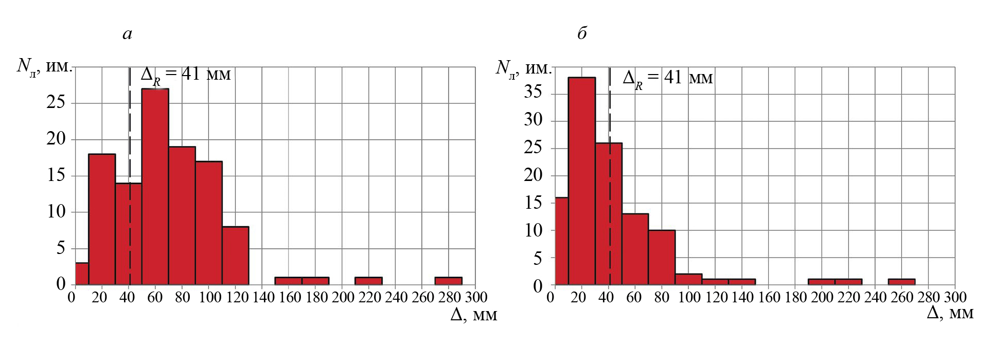 Рис. 7. Гистограмма распределения погрешности (p) индикаций АЭ-событий, полученные с применением стандартной (а) и разработанной (б) методик