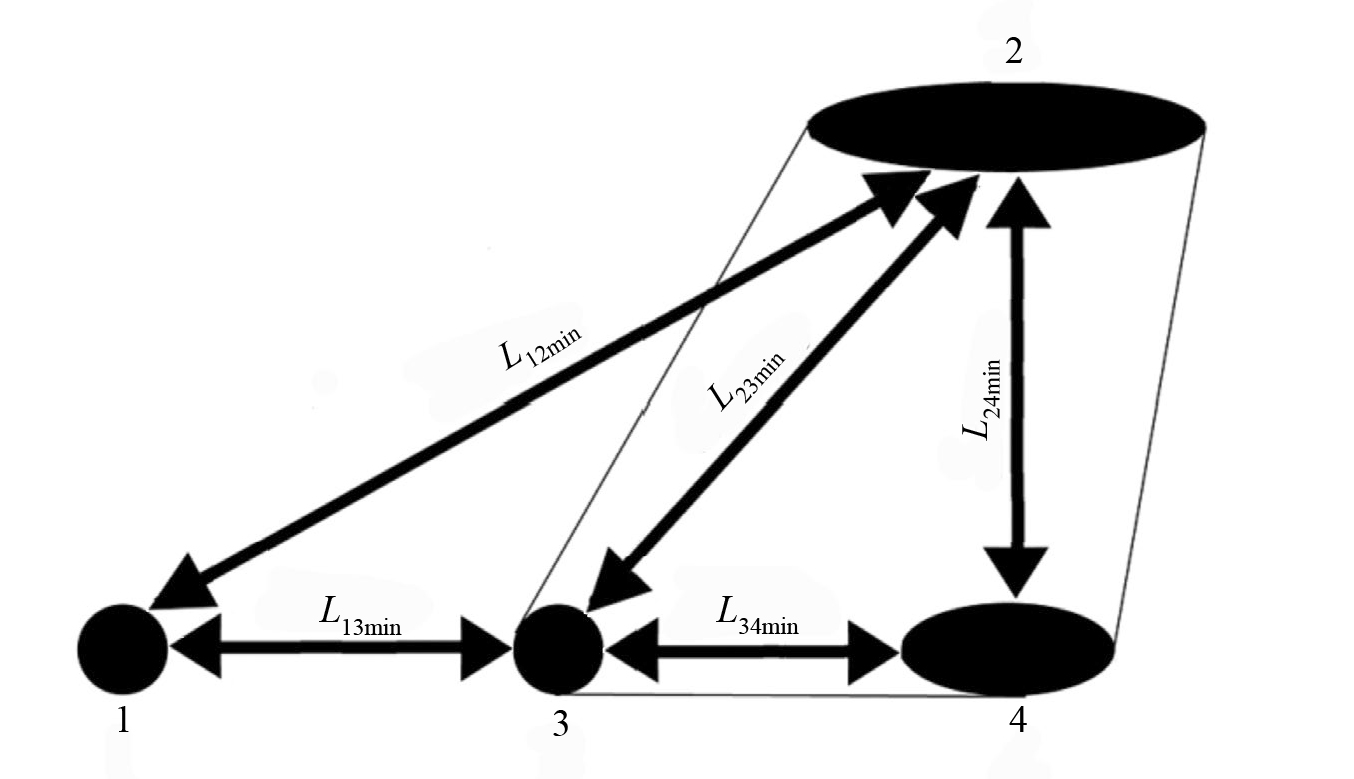 Рис. 1. Обобщенная схема определения расстояний между дефектами: L12min, L13min, L23min, L24min, L34min — минимальные расстояния между дефектами