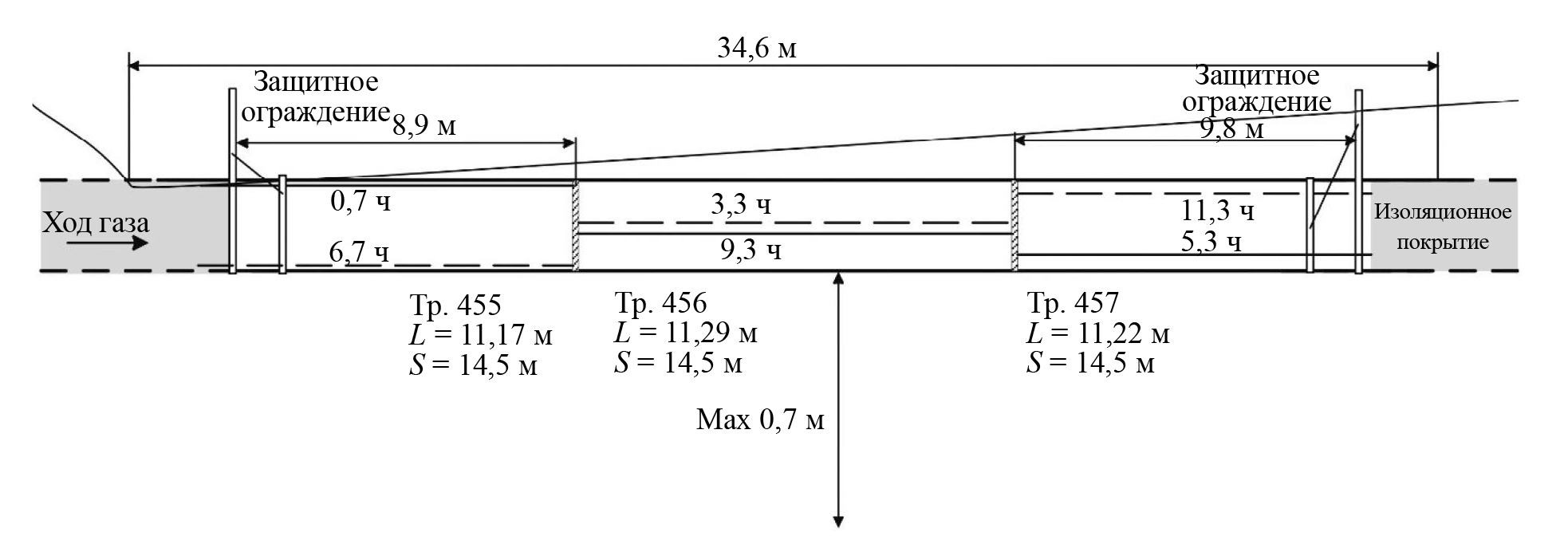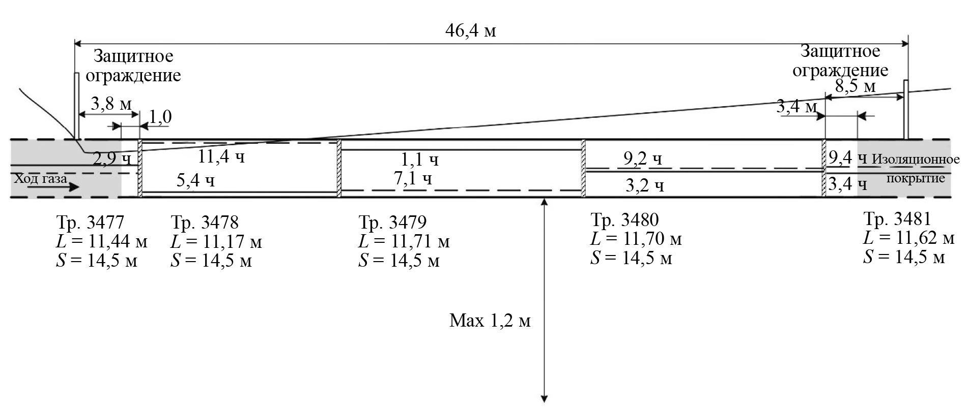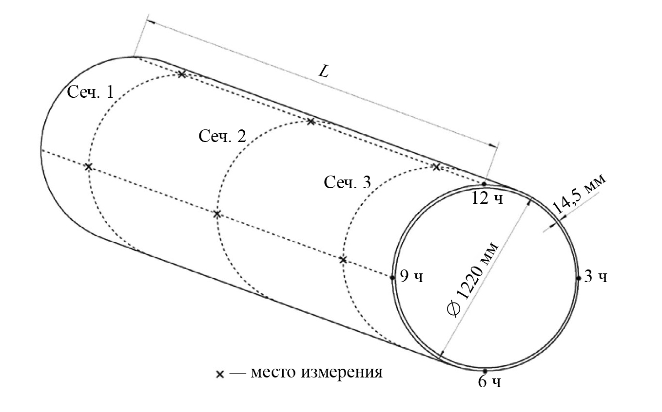 Полевые исследования проводились на участках трубопровода двух труб (рис. 1 и 2), являющихся надземными переходами, с одинаковым номинальным диаметром и толщиной стенки (упрощенная схема этих труб с указанием номинальных размеров показана на рис. 3). Длины надземного перехода L для труб «А» и «Б» были равны 46,4 и 34,6 м соответственно. Материал трубопровода — конструкционная сталь 17Г1С [20].