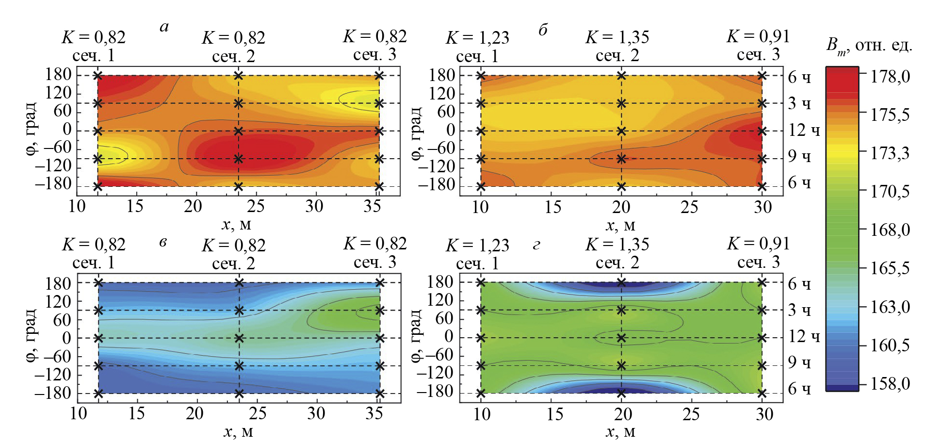 На рис. 6—8 представлены карты распределения максимальной магнитной индукции Bm, коэрцитивной силы Hc и остаточной магнитной индукции Br, полученные с помощью ММТ-3 при измерении по оси (а, б) и по кольцу (в, г) трубопровода.