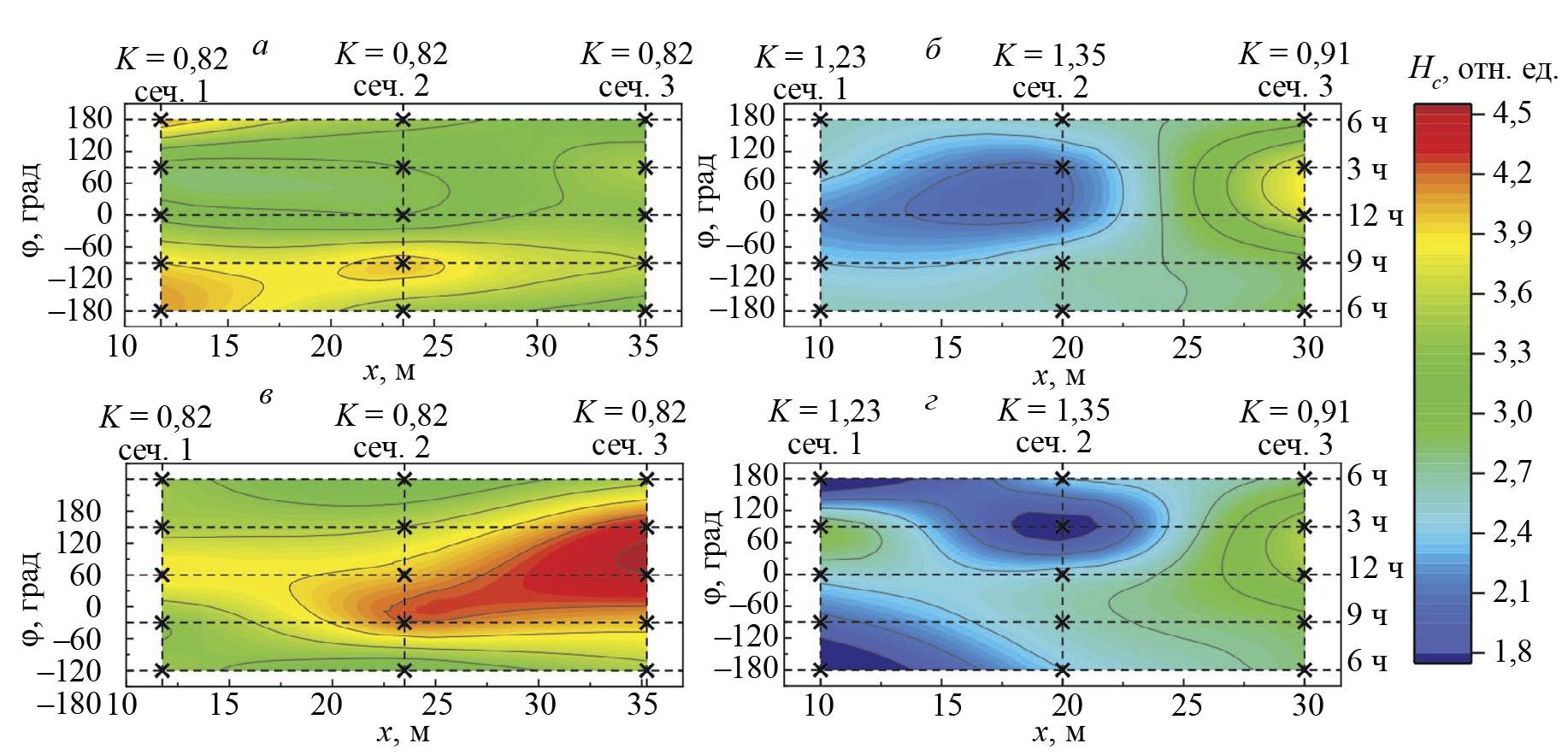 На рис. 7 видна тенденция к уменьшению Hc при увеличении K как по оси, так и по кольцу. Наиболее заметна такая тенденция на 3 и 12 ч при измерении по оси и на 3 ч при измерении по кольцу.