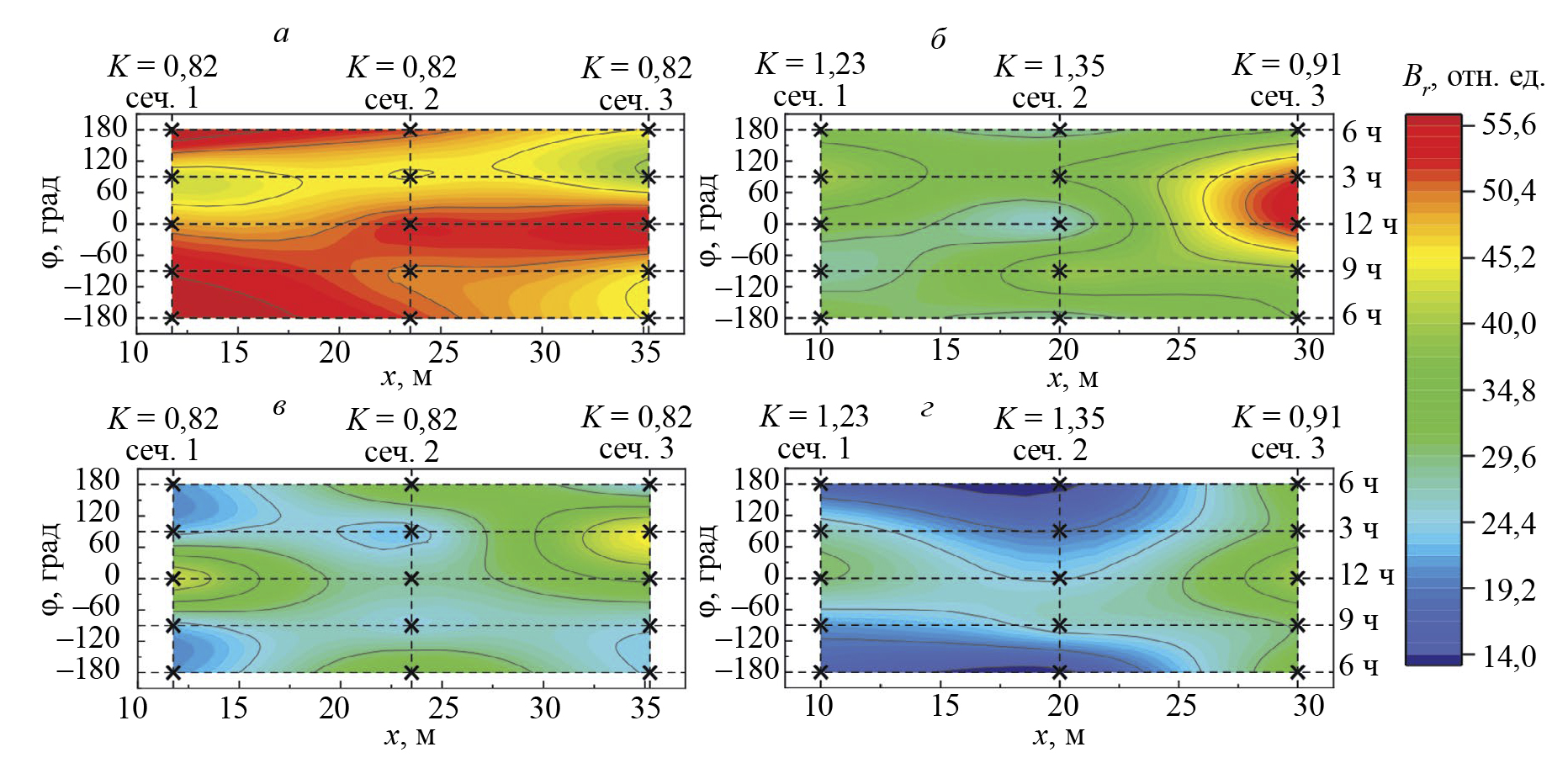 - При измерении с помощью КРМ-Ц-К2М наибольший градиент по оси наблюдался на 3 ч, а по кольцу — на 3 и 12 ч (см. рис. 9).