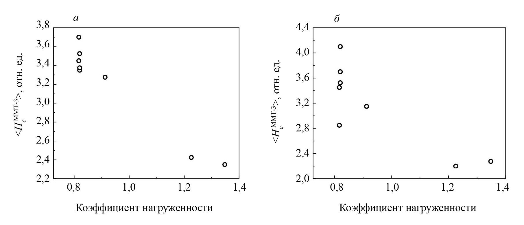 Рис. 10. Зависимость усредненной по четырем зонам в сечении трубы коэрцитивной силы, измеренной с помощью ММТ-3 по оси (а) и по кольцу (б), от коэффициента нагруженности