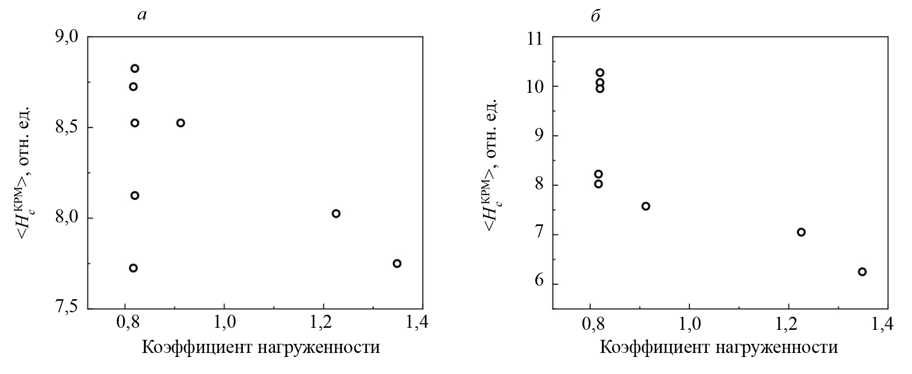 Рис. 12. Зависимость усредненной по четырем зонам в сечении трубы коэрцитивной силы, измеренной с помощью КРМ-Ц-К2М по оси (а) и по кольцу (б), от коэффициента нагруженности