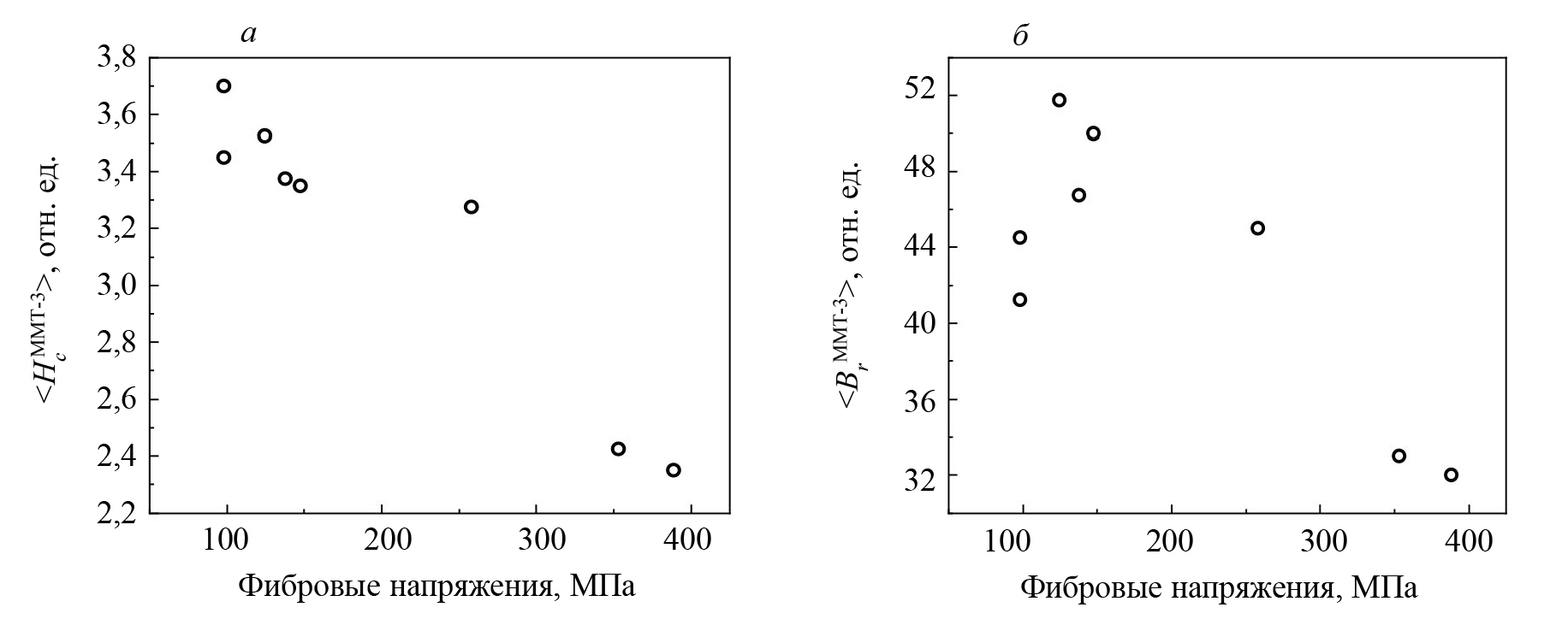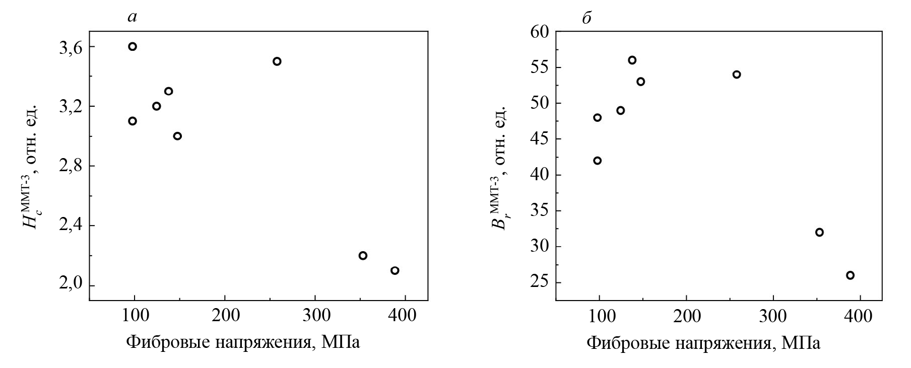 Рис. 13. Зависимость усредненных по четырем зонам в сечении трубы значений коэрцитивной силы (а) и остаточной магнитной индукции (б), измеренной с помощью ММТ-3 по оси, от фибровых напряжений