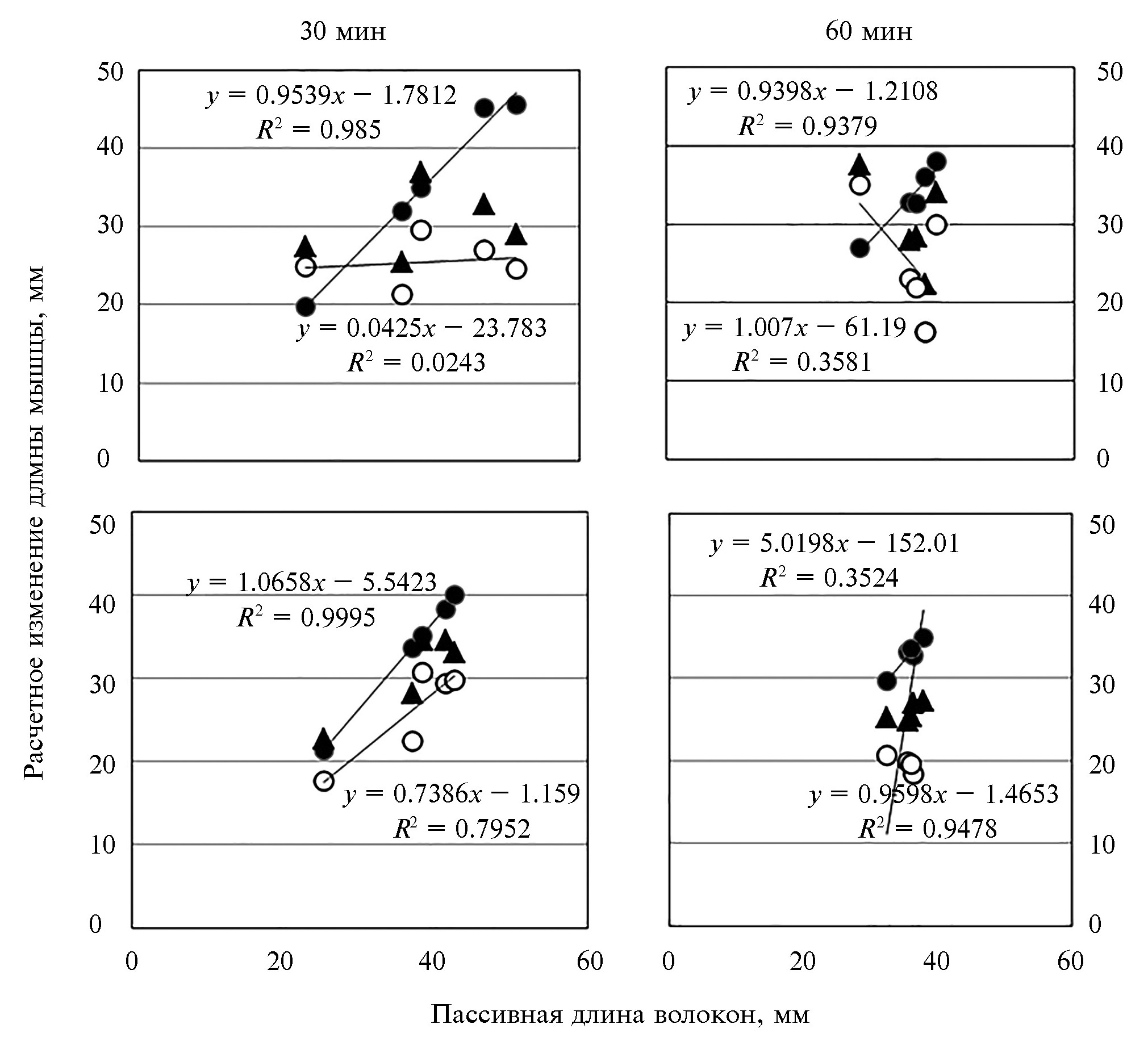 Взаимосвязь между длиной волокон в пассивном состоянии и предполагаемым изменением длины мышц для МИМ (нейтральное положение голеностопного сустава) до и после 7-недельной немодулированной низкочастотной электростимуляционной “тренировки” для 1 группы (30 мин) и 2 группы (60 мин) испытуемых.