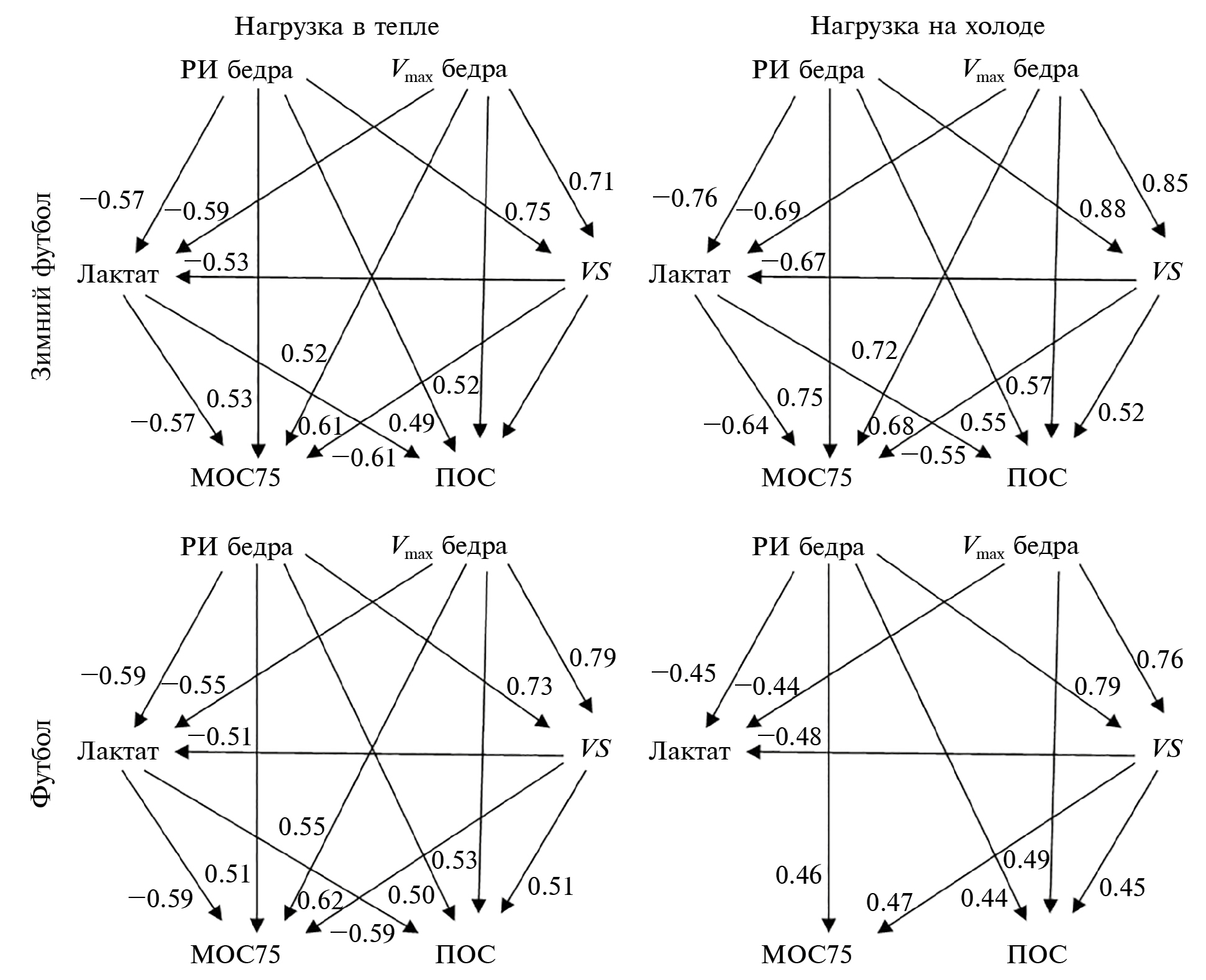 При выполнении физической нагрузки на холоде картина в разных группах спортсменов принципиально различается. У игроков группы Ф наблюдается снижение силы корреляционных связей и уменьшение их числа. Корреляция изменения концентрации лактата с динамикой величины МОС 75 становится недостоверной, а с динамикой величины ПОС — слабой. Снижаются связи между динамикой показателей дыхания и кровотока, а также кровотока и концентрации лактата. Противоположную картину можно наблюдать у спортсменов группы ЗФ. Можно отметить усиление всех связей, особенно значительно возрастает связь между динамикой показателей кровотока и МОС 75, а также показателей кровотока и концентрации лактата.