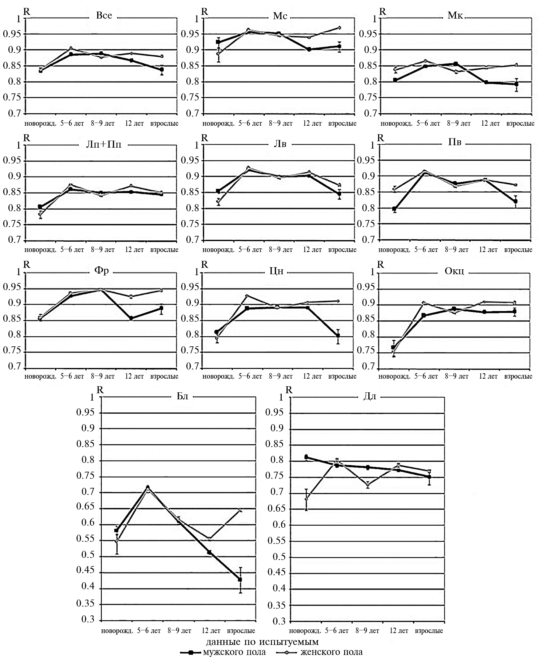Отдельного внимания заслуживает динамика уровня КМС по комбинации «Окц» у мужчин: достигая уровня 0.87 у детей 5–6 лет (после 0.77 у новорожденных), КМС выходит на плато – держится на этом уровне во всех возрастных группах с очень небольшими колебаниями (0.89 у мальчиков 8–9 лет, 0.88 – у 12-летних, 0.88 – у взрослых испытуемых, рис. 3, табл. 1). Это самая «стабильная» комбинация у лиц мужского пола.