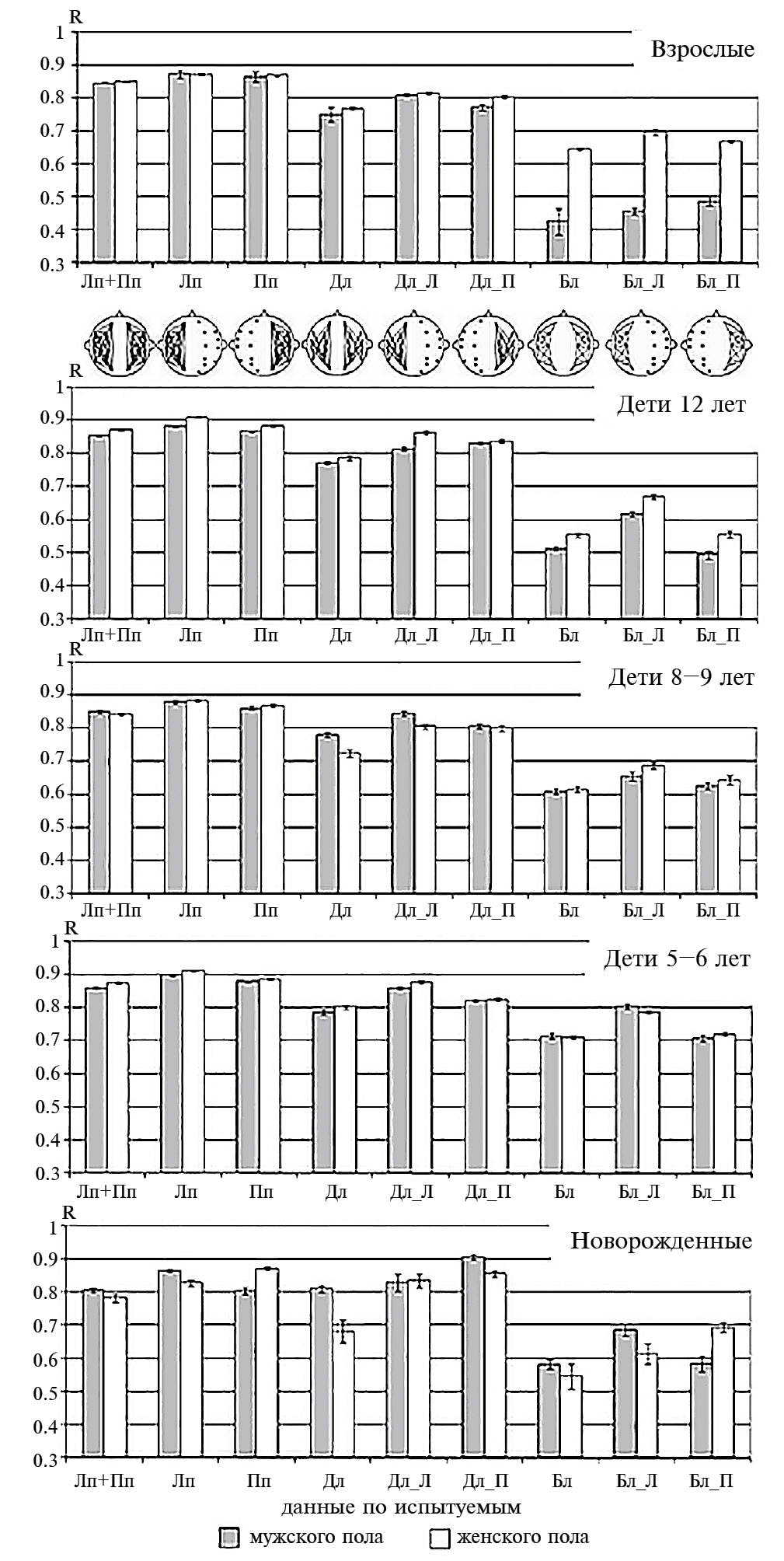 Рис. 4. Средние величины коэффициентов межиндивидуального сходства пространственных структур дистантных взаимосвязей ЭЭГ в группах лиц мужского пола (серые столбики) и женского пола (белые столбики) в трех основных («Лп+Пп», «Дл» и «Бл») и шести дополнительных комбинациях связей ЭЭГ («Лп», «Пп», «Дл_Л», «Дл_П», «Бл_Л», «Бл_П»). Обозначения см. раздел Методика.