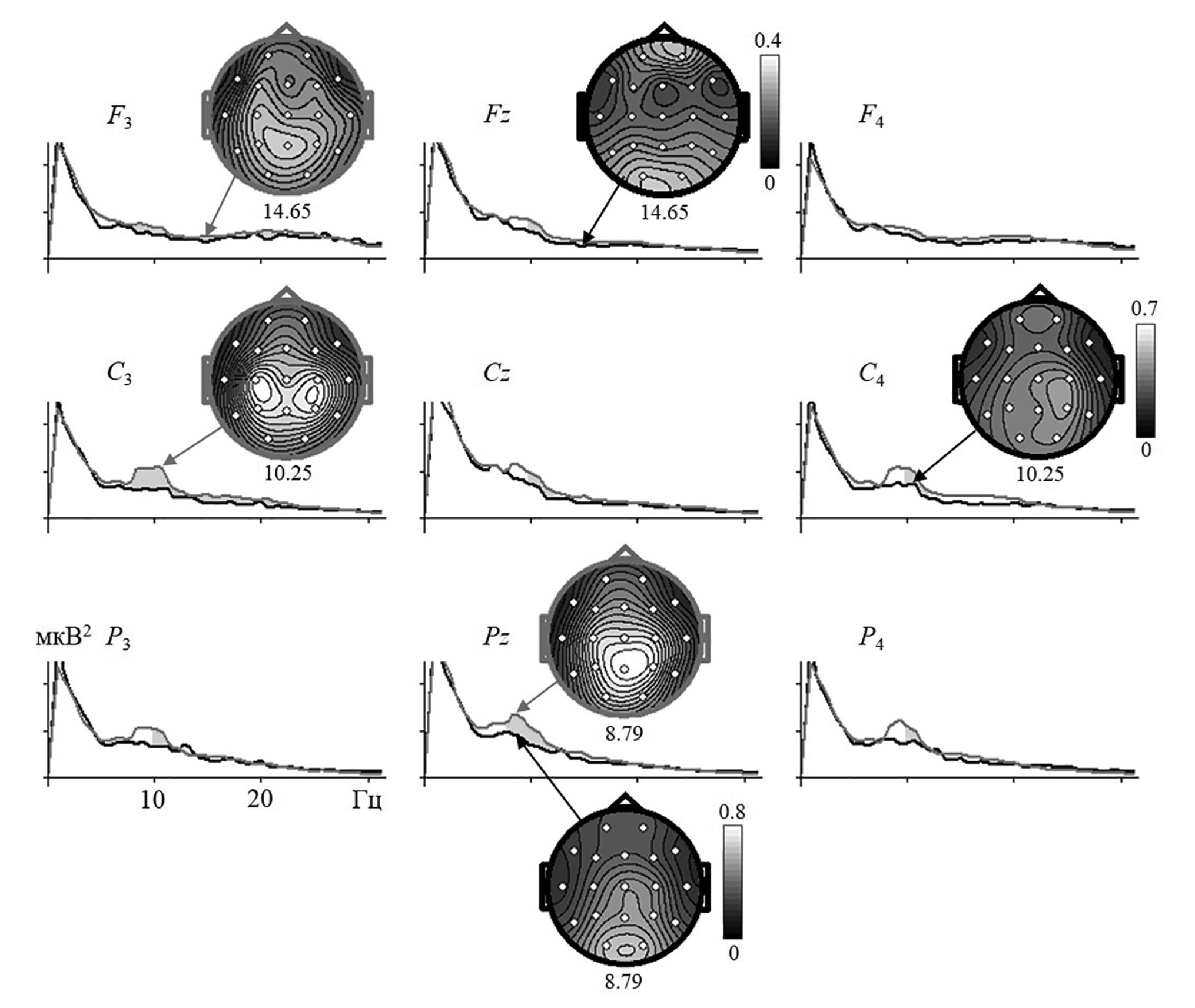 Десинхронизация низкочастотного α-ритма (α1, 8–10 Гц) с некоторым захватом и верхних частот θ-диапазона от 7–8 Гц может наблюдаться в ответ на выполнения почти любого типа задач, отражая общие требования задачи и процессы внимания при их выполнении [51], тогда как десинхронизация в α2-диапазоне частот (10.5–13/14 Гц) часто соотносится с более специфическими когнитивными процессами. В работе [52] показано, что высокочастотный α-диапазон чувствителен к кодированию и обработке семантической информации: десинхронизация α2-ритма соответствовала лучшим результатам испытуемых при выполнении задания на семантическую память.