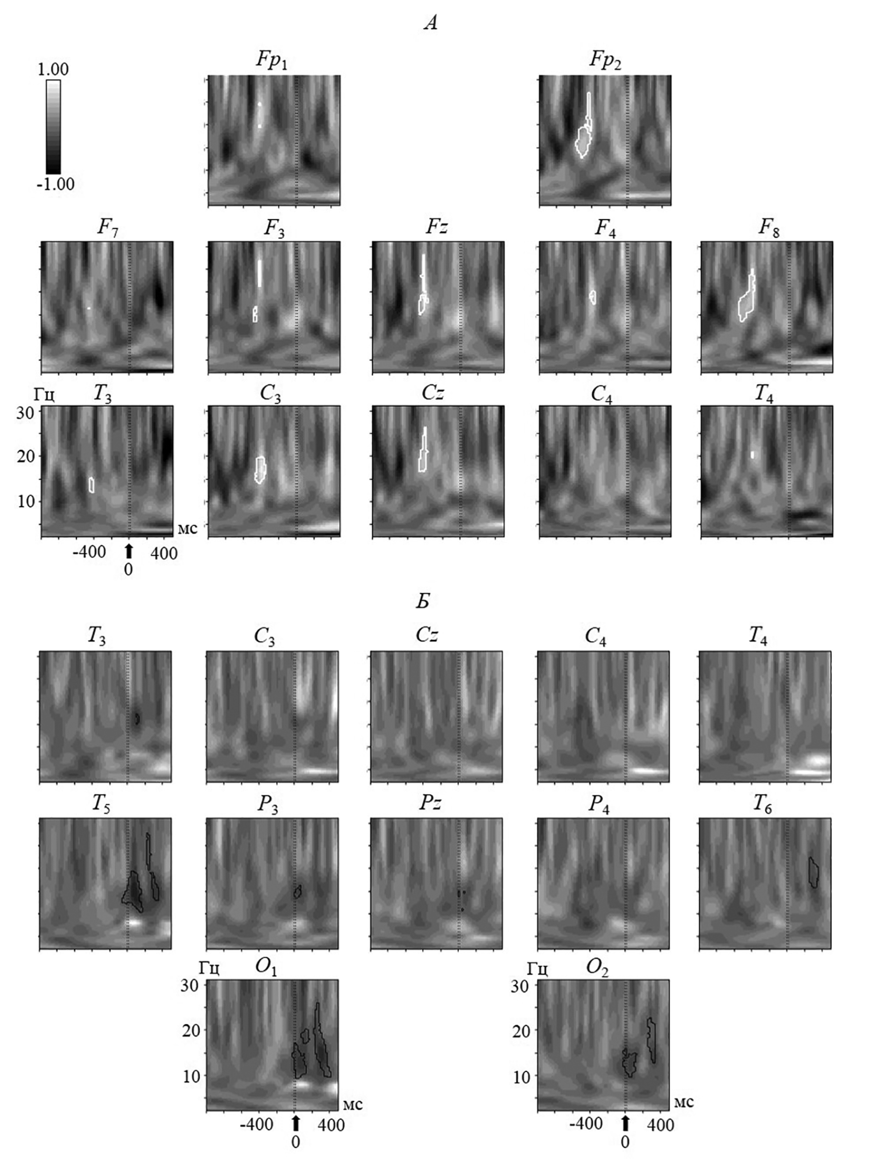 Рис. 3. Частотно-временные разностные карты при сравнении связанной с событием синхронизации электроэнцефалограмм (ЭЭГ) в период эмоционально-эстетической оценки живописных произведений между художниками и нехудожниками при высокой (А) и низкой (Б) субъективной эмоционально-эстетической оценке картин. Fp1–O2 — позиции электродов (по системе 10/20), на каждом графике по оси х — время (мс): одно деление шкалы — 200 мс, вертикальная линия – начало ответа (первое нажатие на кнопку); по оси y —частота (Гц). Тоновая шкала соответствует разности мощности ЭЭГ (условные единицы). Белая линия (А) – значимый кластер синхронизации; черная линия (Б) – значимые кластеры десинхронизации ЭЭГ.