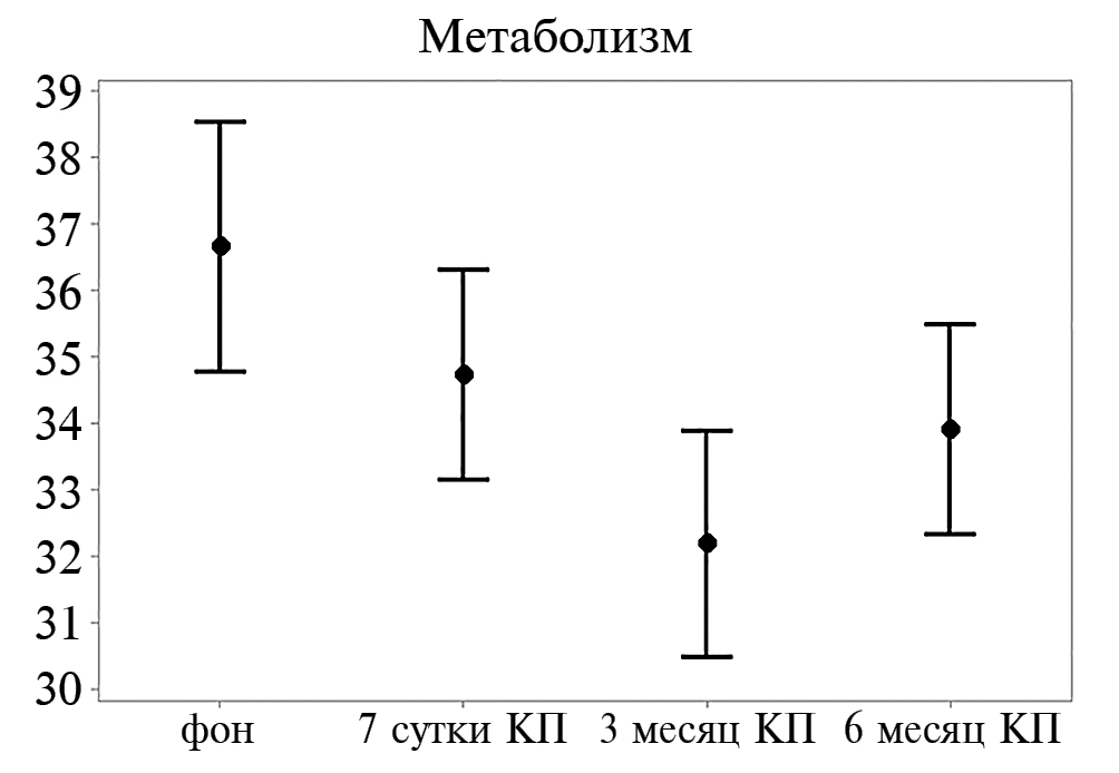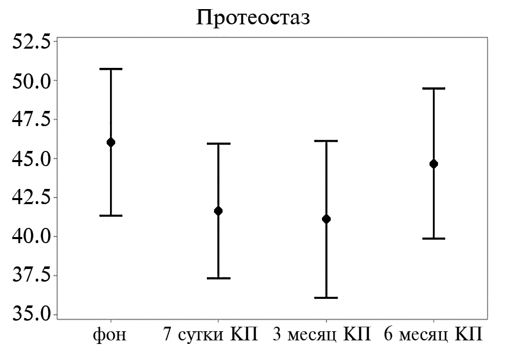 С помощью однофакторного дисперсионного анализа показателей обогащения белками групп биологических внутриклеточных процессов удалось выявить достоверную динамику в течение полета в группах "энергетика", "презентация молекул на мембране, инициация иммунной защиты", "протеостаз" и "метаболизм". Характер этой динамики указывал, что комплексы механизмов протеостаза и внутриклеточных процессов, относящихся к презентации молекул на мембране и инициации иммунной защиты – реагируют на невесомость остро – снижение белковой представленности в этих процессах выявляется резко уже через 7 сут КП. Биологические процессы, отнесенные к категориям "энергетика" и "метаболизм", также снижают свою активность, но позднее, в интервале времени до 3-го месяца полета.