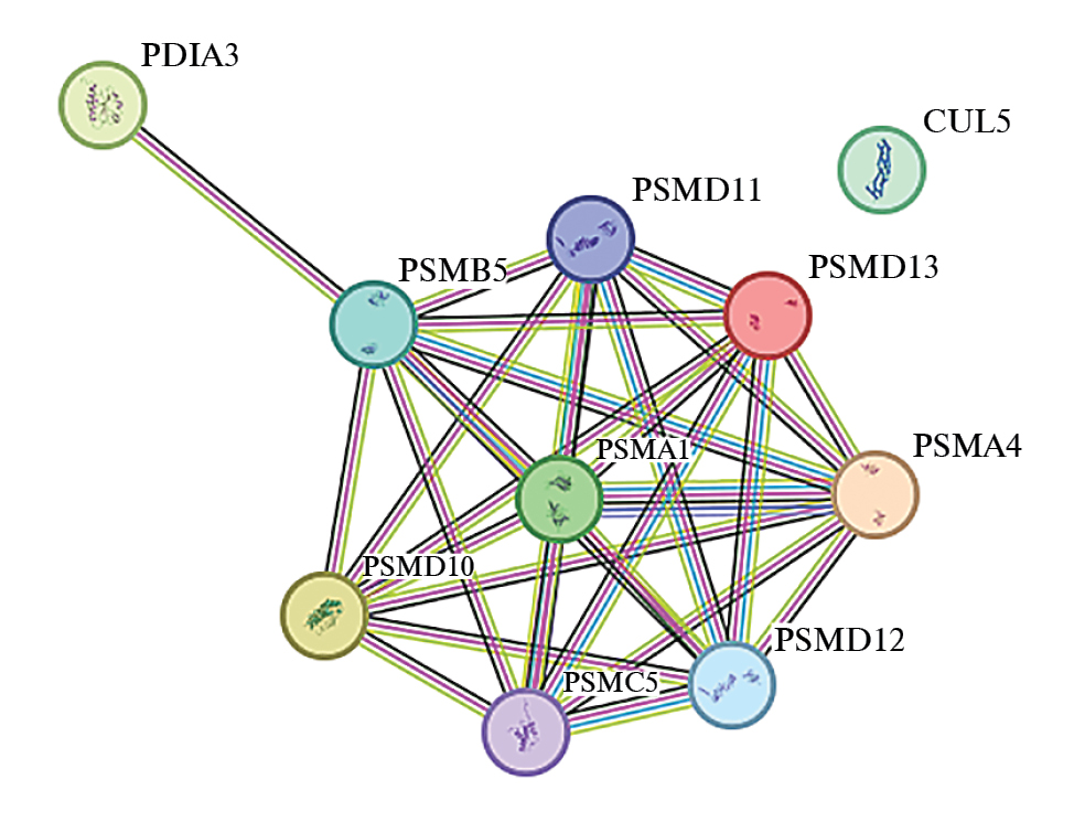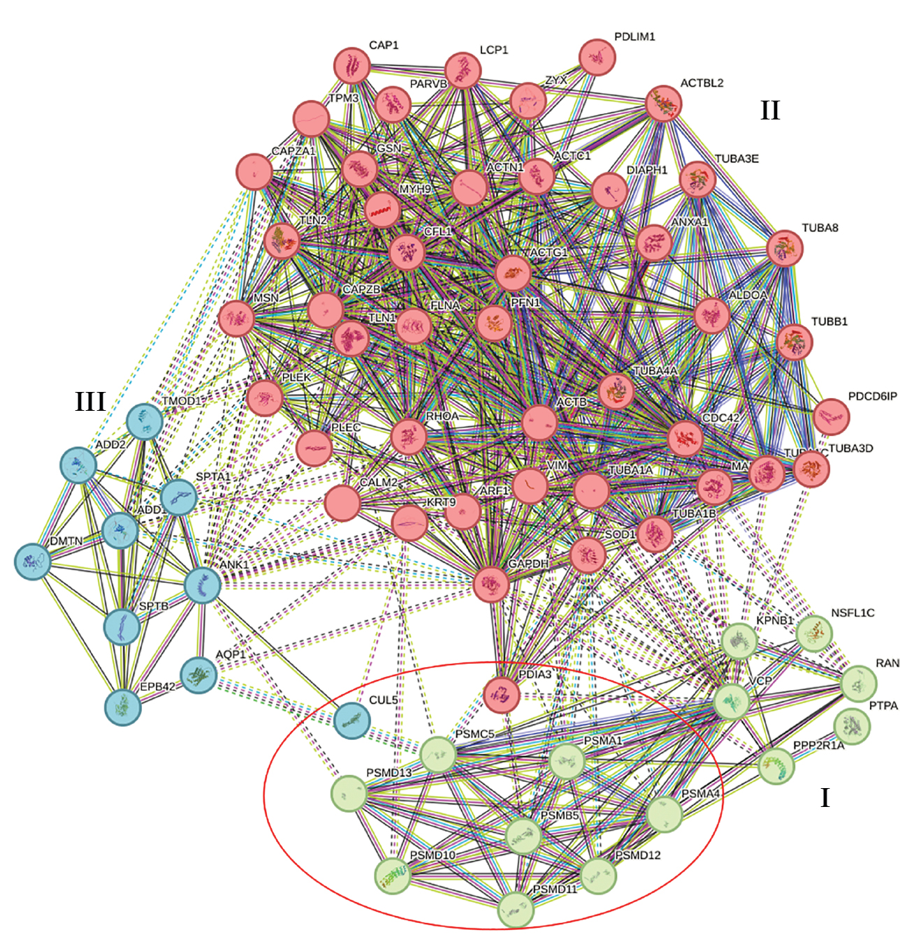 При построении белковых сетей взаимодействий с белками цитоскелета с помощью программы String (рис. 6) выявлено, что все белки протеасом, как и ожидалось, относятся к одному кластеру (кроме куллина 5 (CUL5), одного из компонентов убиквитинлигазного комплекса E3, ответственного за убиквитилирование белка, и дисульфидизомеразы A3 (PDIA3)). Однако к кластеру протеасом (кластер I) также относятся белки организации цитоскелета, которые имели большое количество связей с белками протеасом и образовали узлы связи с другими белками цитоскелета (валозинсодержащий белок (VCP), кофактор р47 (NSFL1C), постоянная регуляторная субъединица протеинфосфатазы 2 (PPP2R1A), ядерный белок (RAN)). Белки VCP, NSFL1C, PPP2R1A регулируют актиновый цитоскелет во время митоза, в том числе разделение аппарата Гольджи, формирование веретена деления, локализацию центромер. Также белки протеасом были напрямую связаны с кластером белков цитоскелета (кластер II) посредством взаимодействия с белками: трансформирующим белком RhoA, который является небольшим протеином в семействе Rho GTPases (RHOA) (c ним связана 26S протеасомная неатфазная регуляторная субъединица 10, или ганкирин, (PSMD10)), глицеральдегид-3-фосфатдегидрогеназой (GAPDH), цепью α-1B тубулина (TUBA1B), β-1 (TUBB1) цепью α-1C тубулина (TUBA1C), аннексином A1 (ANXA1), альдолазой А (ALDOA), С-реактивным белком (СAPZB), β-актином (ACTB) и кластером мембранных белков, ассоциированных с организацией цитоскелета (аквапорином-1 (AQP1), эритроцитарным анкирином (ANK1) (кластер III). Ввиду своей мембранной локализации куллин 5 (CUL5) отнесен программой в кластер мембранных белков, при этом показано, что он оказывает влияние на динамику цитоскелета [42].