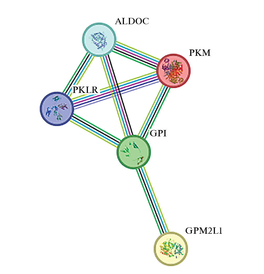 Рис. 7. Взаимодействия 5 белков, относящихся к процессам энергетического метаболизма, представленность которых достоверно снизилась во время космического полета.