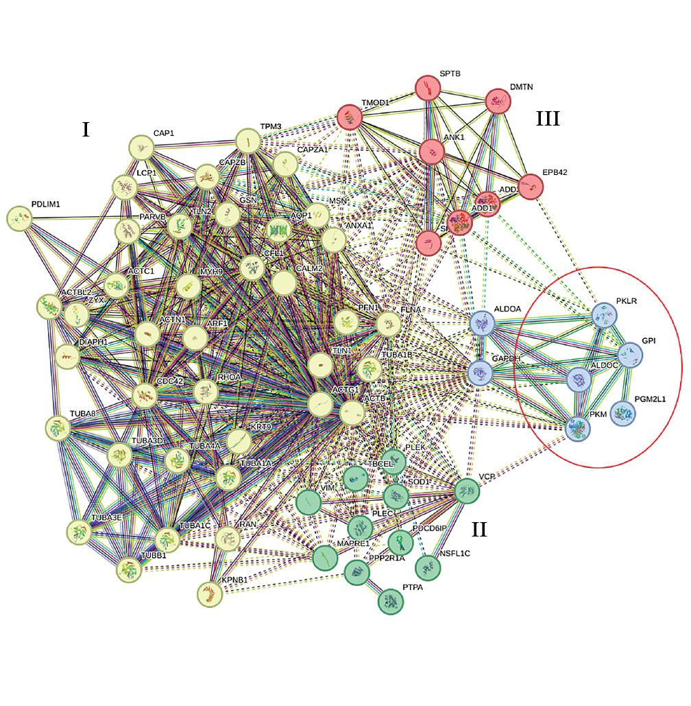 Аналогично были построены молекулярные сети взаимодействий с белками цитоскелета с помощью программы String (рис. 8). Кластеризация по методу к-средних отнесла белки гликолиза в один кластер с белками альдолаза А (ALDOA) и глицеральдегид-3-фосфатдегидрогеназой (GAPDH), которые, помимо участия в гликолизе, влияют на организацию цитоскелета (GAPDH модулирует организацию и сборку цитоскелета, ALDOA вместе с кофилином поддерживает полимеризацию и деполимеризацию актиновых нитей в упорядоченном динамическом равновесии). Метод к-средних выделил 3 кластера среди белков цитоскелета. На рис. 8 самый большой кластер (кластер I) представляет собой белки актинового цитоскелета и микротрубочек, как структурные, так и регуляторные. Белки II кластера относятся к белкам микротрубочек, задействованных в митозе. III кластер представляет собой мембрано-связанные белки цитоскелета. С каждым из кластеров белки гликолиза имели прямые связи: с первым кластером через белки – профилин-1 (PFN1), талин-1 (TLN1), филамин А (FLNA), цепь α-1B тубулина (TUBA1B), β-актин (ACTB), γ-актин (ACTG1), со вторым кластером через валозин-содержащий белок (VCP), и с третьим кластером – через α-аддуцин (ADD1), аддуцин-2 (ADD2), мембранный белок эритроцитов 4.2 (EPB42), α-цепь спектрина эритроцитов (SPTA1).