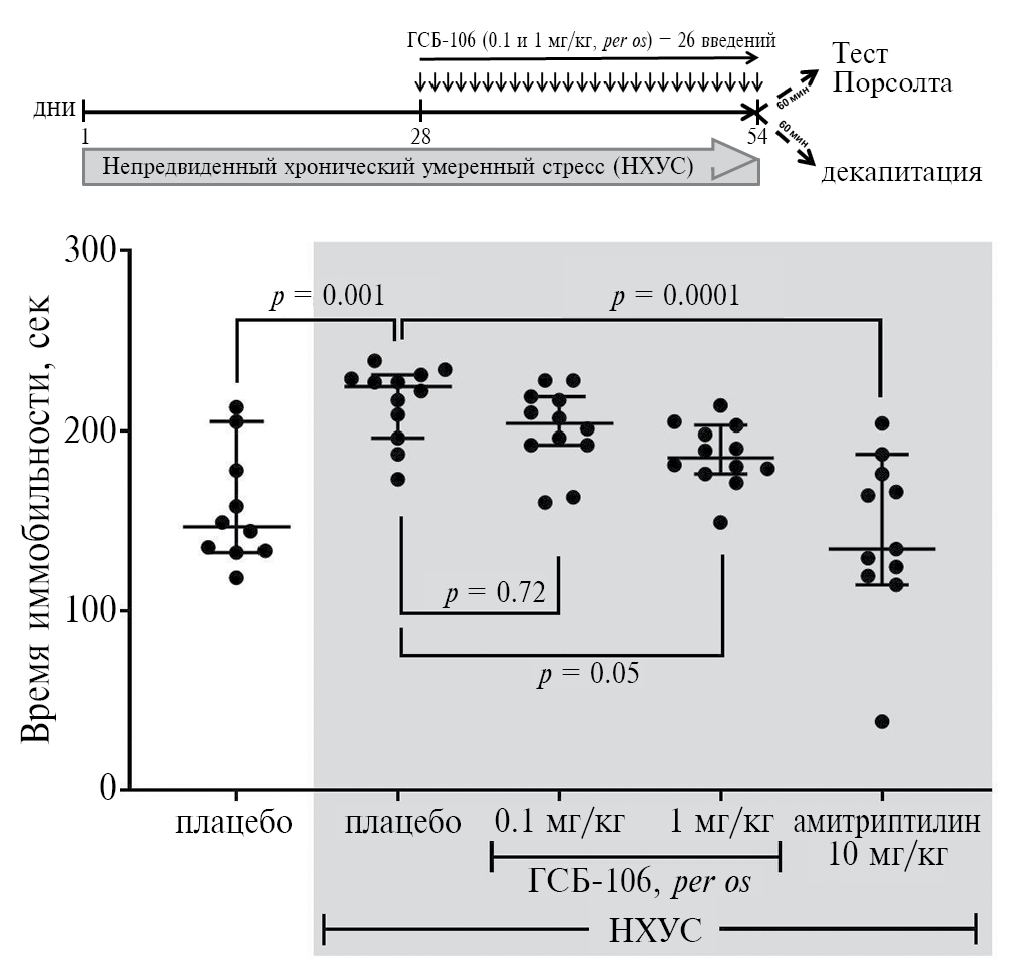 Рис. 3. ГСБ-106 ослабляет депрессивно-подобное поведение в тесте Порсолта на модели непредвиденного хронического умеренного стресса на мышах BALB/C (по [30]).