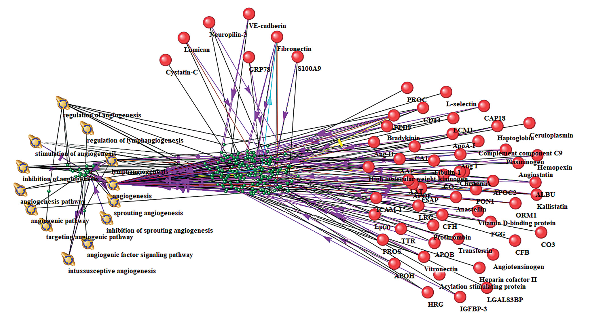 Использование программы ANDVisio [7], осуществляющей построение ассоциативных сетей белок-белковых взаимодействий путем поиска взаимосвязей между молекулярно-генетическими объектами и процессами, позволило установить связь с процессами ангиогенеза всех белков, достоверно изменяющихся в процессе КП (рис. 2).