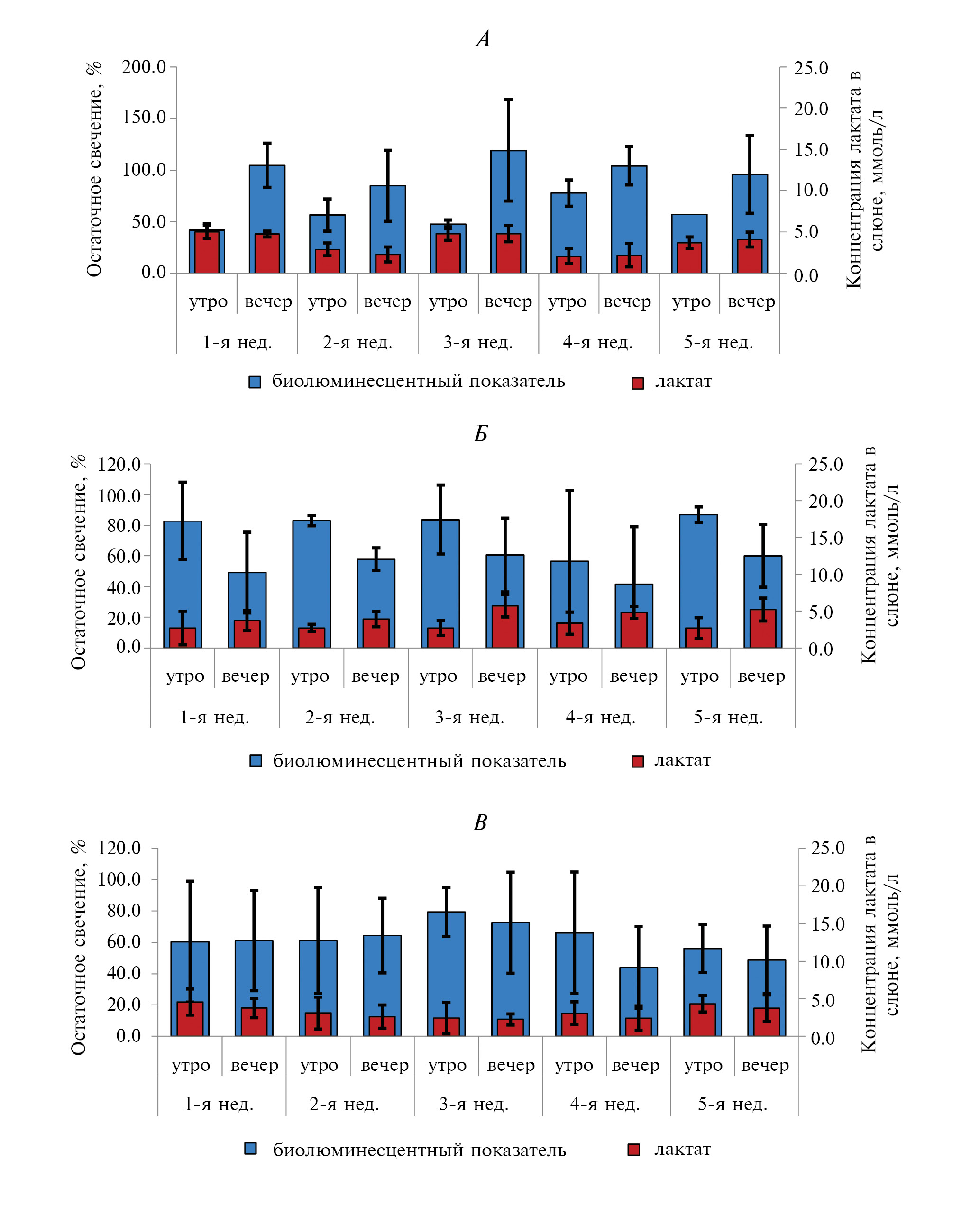Рис. 1. Изменение усредненного показателя остаточного свечения для слюны и концентрации лактата в слюне до и после рабочей смены в течение 5 нед. у сотрудников, относящихся к 1-й подгруппе (А), 2-й подгруппе (Б) и 3-й группе (В) обследуемых
