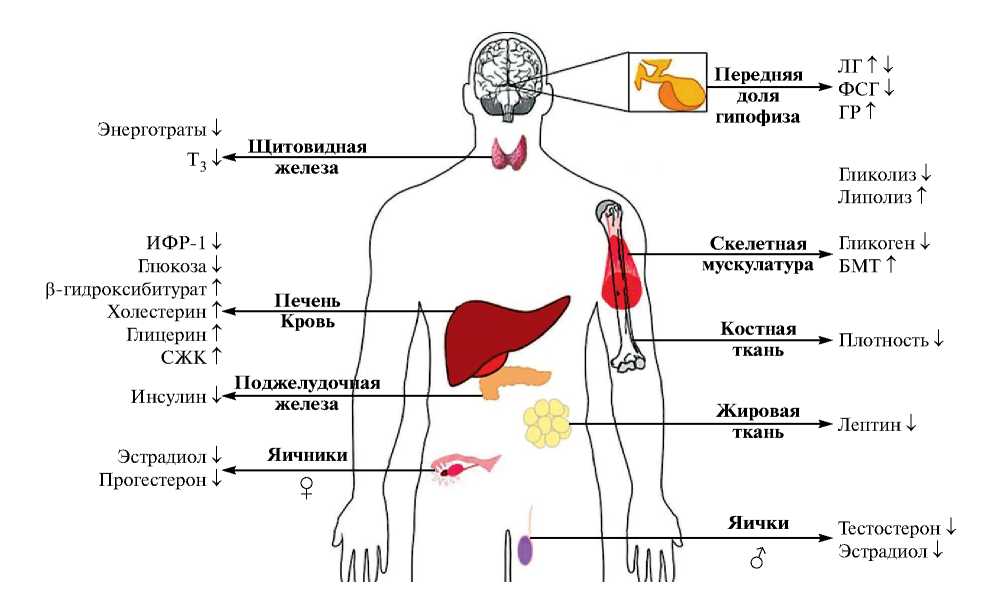 Рис. 3. Обзор отдельных эффектов для организма на фоне низкой доступности энергии. T3 – трийодтиронин, ИФР-1 – инсулиноподобный фактор роста, СЖК – свободно-жирные кислоты, ЛГ – лютеинизирующий гормон, ФСГ – фолликулостимулирующий гормон, ГР – гормон роста, БМТ – безжировая масса тела.