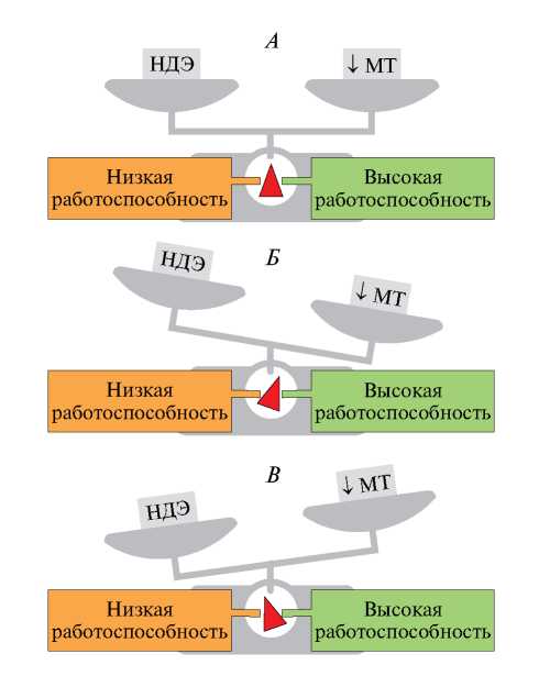 Длительное пребывание в состоянии НДЭ также нарушает мышечную адаптацию, важную как для спортсменов, тренирующих выносливость, так и для занимающихся силовыми видами спорта [37]. В некоторых случаях влияние НДЭ на физическую работоспособность может быть замаскировано эффектом снижения МТ (рис. 4). Потеря МТ может маскировать сниженную физическую работоспособность у спортсменов с НДЭ (рис. 4, А). В этом случае для спортсменов характерна средняя физическая работоспособность, при этом положительный эффект снижения МТ равен отрицательному влиянию НДЭ. Положительный эффект потери МТ, как правило, сопровождается высокой физической работоспособностью и перевешивает негативное влияние НДЭ (рис. 4, Б). Тогда для спортсменов характерна высокая физическая работоспособность, но реализовать в полной мере свой потенциал они не могут из-за НДЭ. Когда негативное влияние НДЭ перевешивает положительный эффект снижения МТ, наблюдается снижение физической работоспособности и развивается повышенная утомляемость, связанная с НДЭ (рис. 4, В).