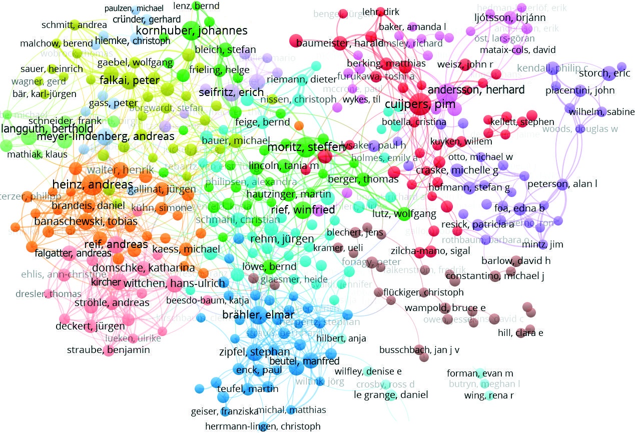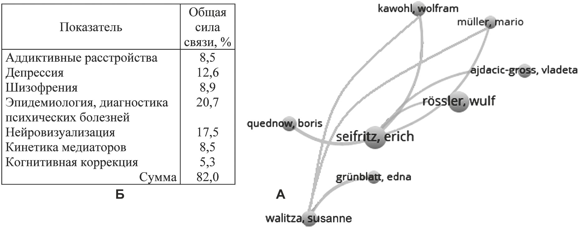 Из 14 проанализированных научных соавторств по психотерапии 10 были аффилированы с учеными из научных организаций Германии. Это необычно, так как значительная часть исследований по психотерапии была представлена учеными из США. Возможно, у этих исследователей было меньше статей в соавторстве. В последние годы отмечается также высокий уровень участия ученых из Германии в коллаборационных статьях [3] с несколькими десятками соавторов из разных стран мира. Феномен нуждается в дополнительном изучении.