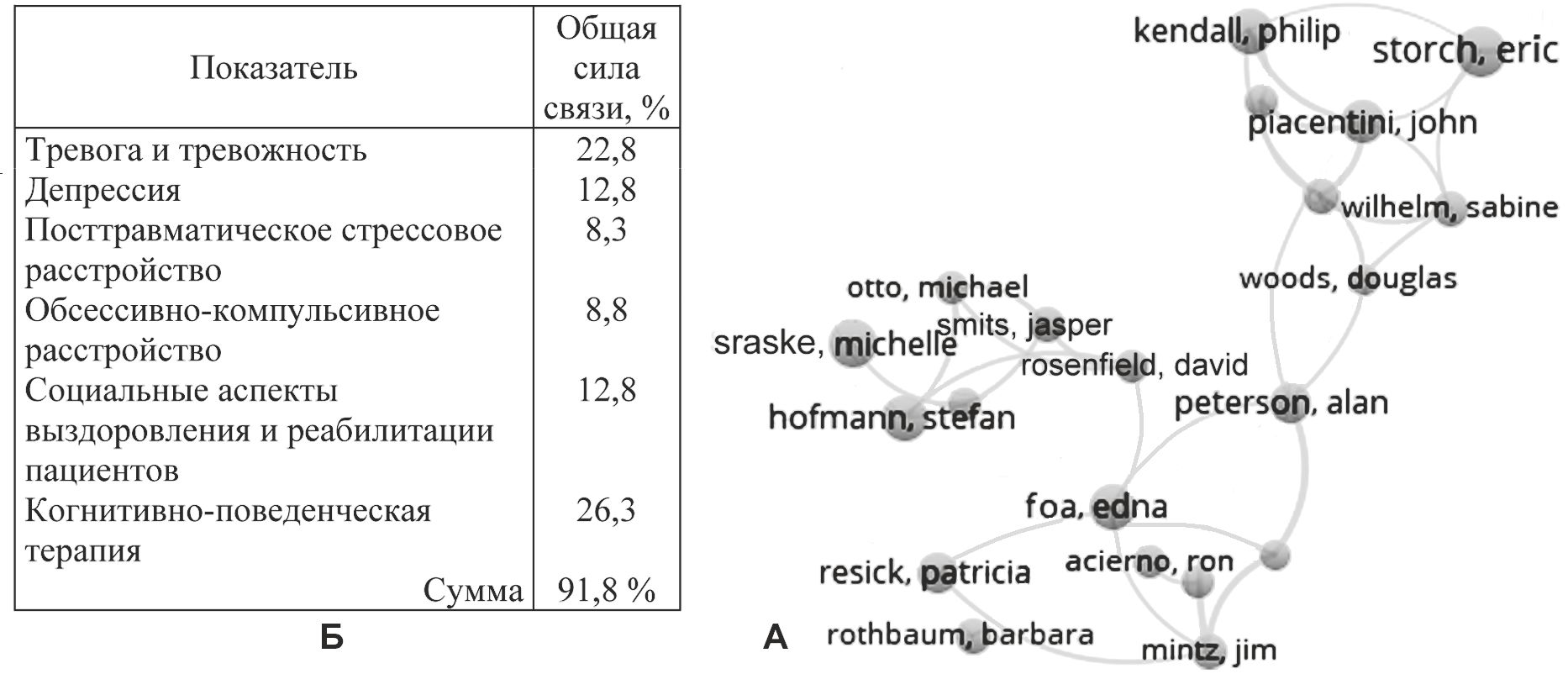 Рис. 20. Основные плеяды авторов (А) и общая сила связи ключевых слов (Б) в статьях 10-го кластера соавторства.