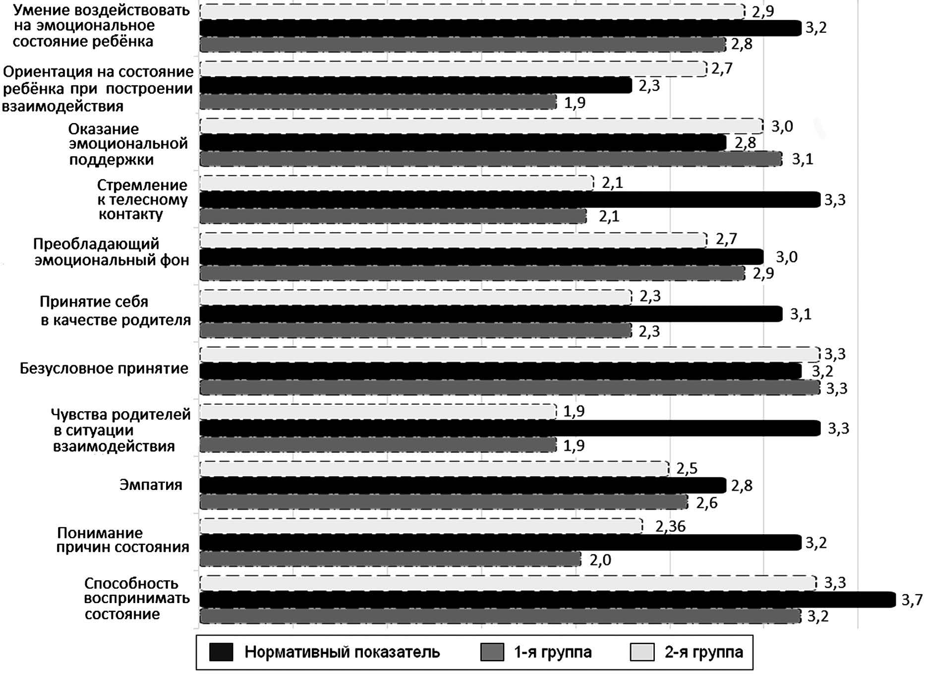 В детско-родительских взаимоотношениях со стороны родителя обнаружено снижение показателей «Способность к восприятию состояния ребенка» и «Понимание причин этого состояния». При этом родители 1-й группы меньше ориентируются при взаимодействии с больным ребенком на его состояние, чем родители 2-й группы (p = 0,001): родители в ситуации лечения в отношениях с ребенком прежде всего ориентируются на рекомендации медицинского персонала и не учитывают эмоциональные потребности ребенка, поскольку цель родителя – физическое выживание его ребенка.