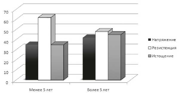 Испытуемые группы 2 (со стажем более 5 лет) предъявляют более выраженное психоэмоциональное истощение, личностное отдаление и эмоциональное выгорание.
