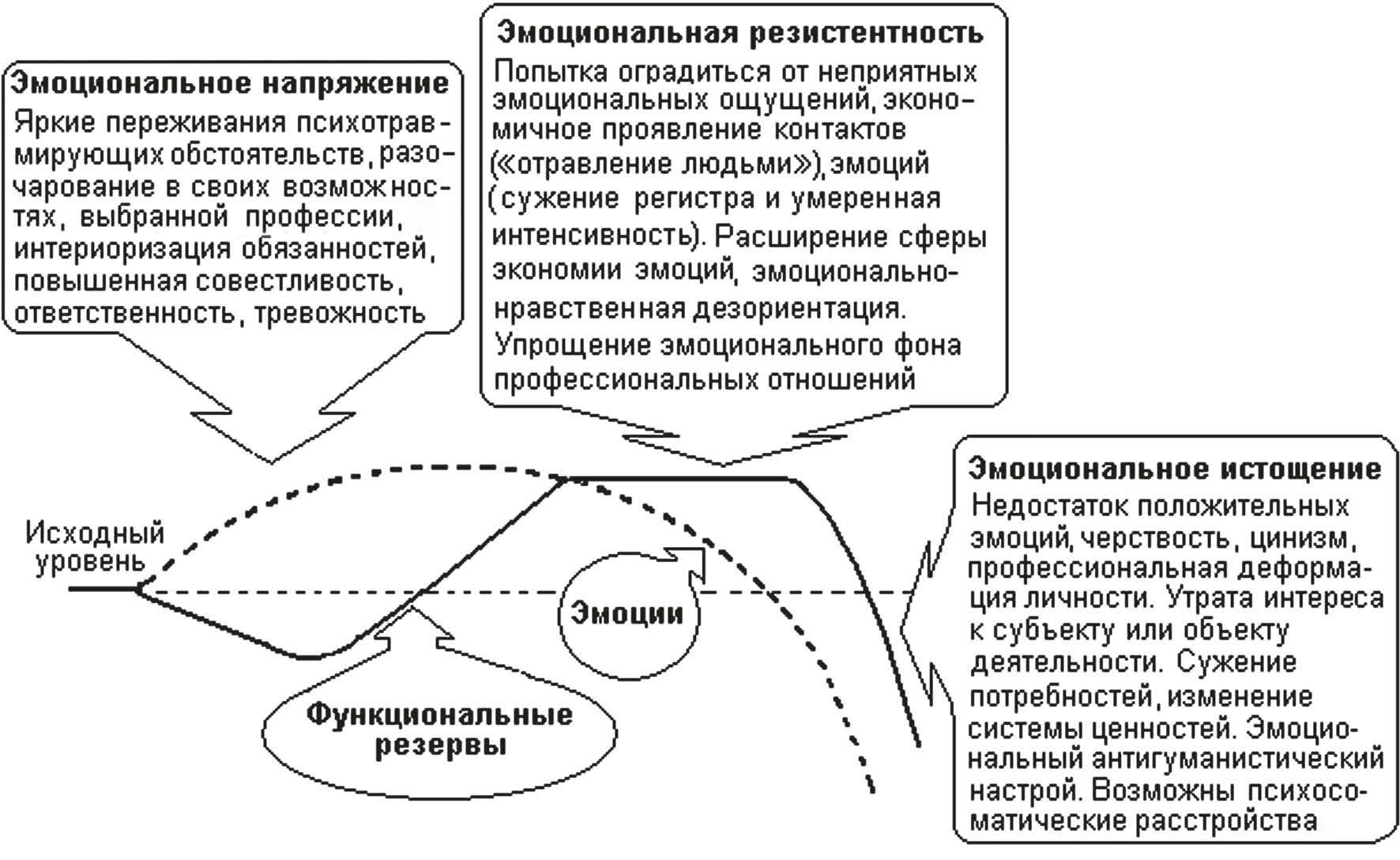 Эмоциональное истощение проявляется психическим утомлением, усталостью, эмоциональной опустошенностью, симптомами депрессии. Вначале наблюдается эмоциональное перенасыщение, сопровождающееся эмоциональными срывами, агрессивными реакциями, вспышками гнева, впоследствии оно сменяется снижением эмоциональных ресурсов, утратой интереса к окружающей действительности. На рис. 2 представлена динамика вероятных эмоциональных нарушений при стрессе.