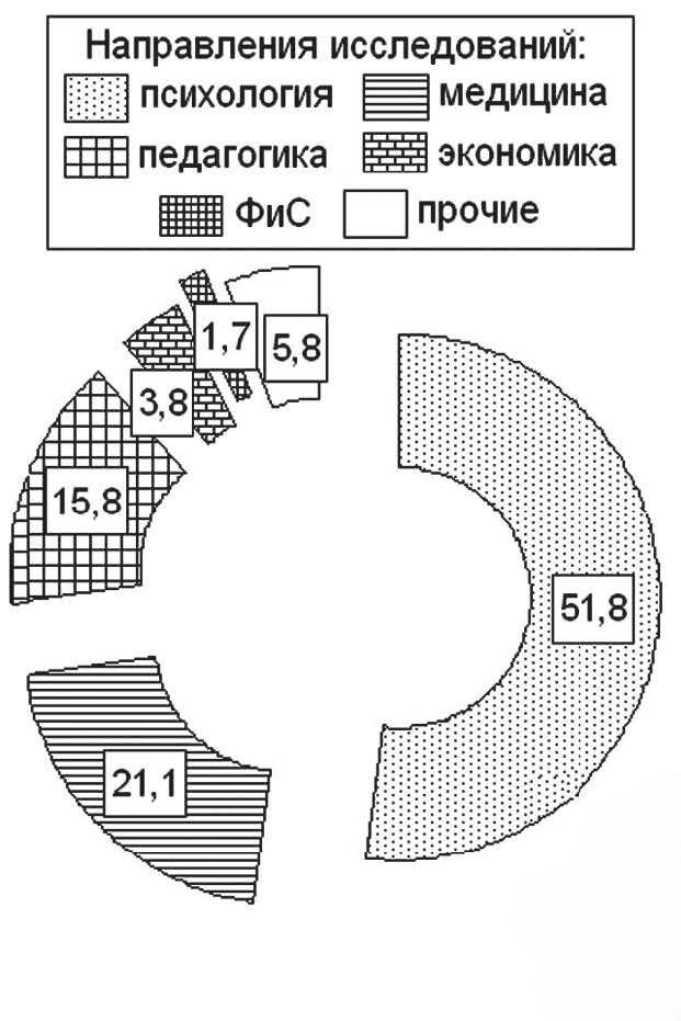 Среднегодовое количество статей было (346 ± 58), в том числе, по психологии – (179 ± 29), медицине – (73 ± 11), педагогике – (54 ± 11), экономике – (13 ± 3), физкультуре и спорту – (6 ± 1). В структуре направлений научных исследований статей по психологии оказалось 51,8 %, по медицине – 21,1 %, педагогике – 15,8 %, экономике – 3,8 %, физкультуре и спорту – 1,7 %, по другим отраслям науки – 5,8 % (рис. 5).