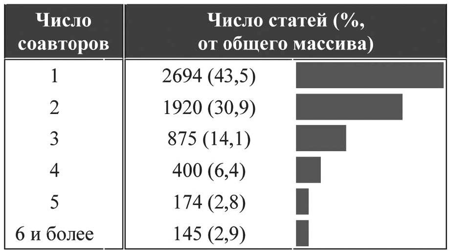 Не имели цитирований 41,3 % статей общего массива, процитированы хотя бы 1 раз – 58,7 %, из них 1 цитирование имели 17,1 % статей, 2 цитирования – 10,1 %, 3 цитирования – 4,8 %, 4 цитирования – 4,8 %, 40 цитирований и более – 0,7 % статей, которые определили индекс Хирша в общем массиве. В общей сложности массив статей подготовили и представили к опубликованию 9432 автора, число соавторств в статьях – 12 661. На рис. 7 изображен частотный анализ соавторств в статьях. Оказалось, что единолично авторы издали 43,5 % статей, с одним соавтором – 30,9 %, с двумя соавторами – 14,1 %. По 2 статьи опубликовали коллективы из 15 и 17 соавторов.